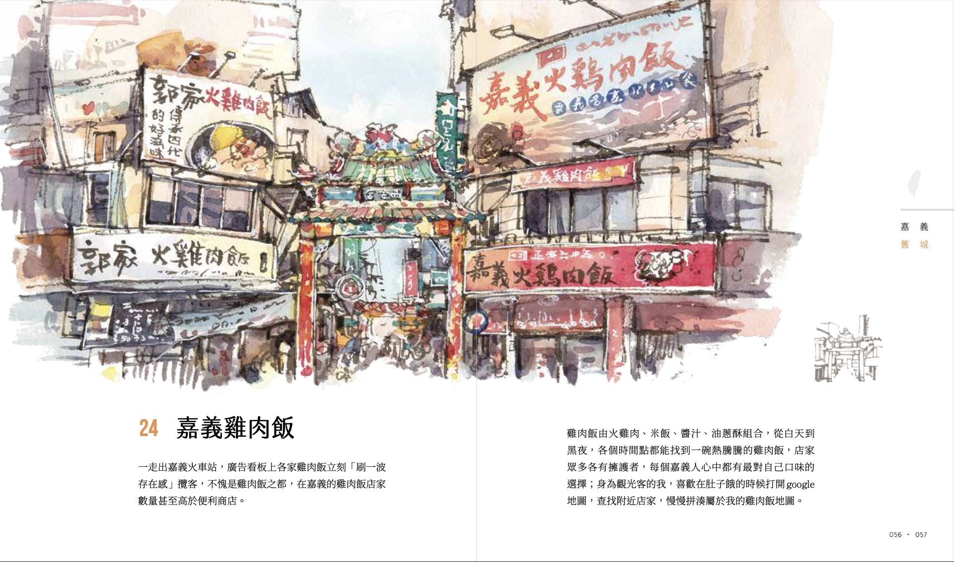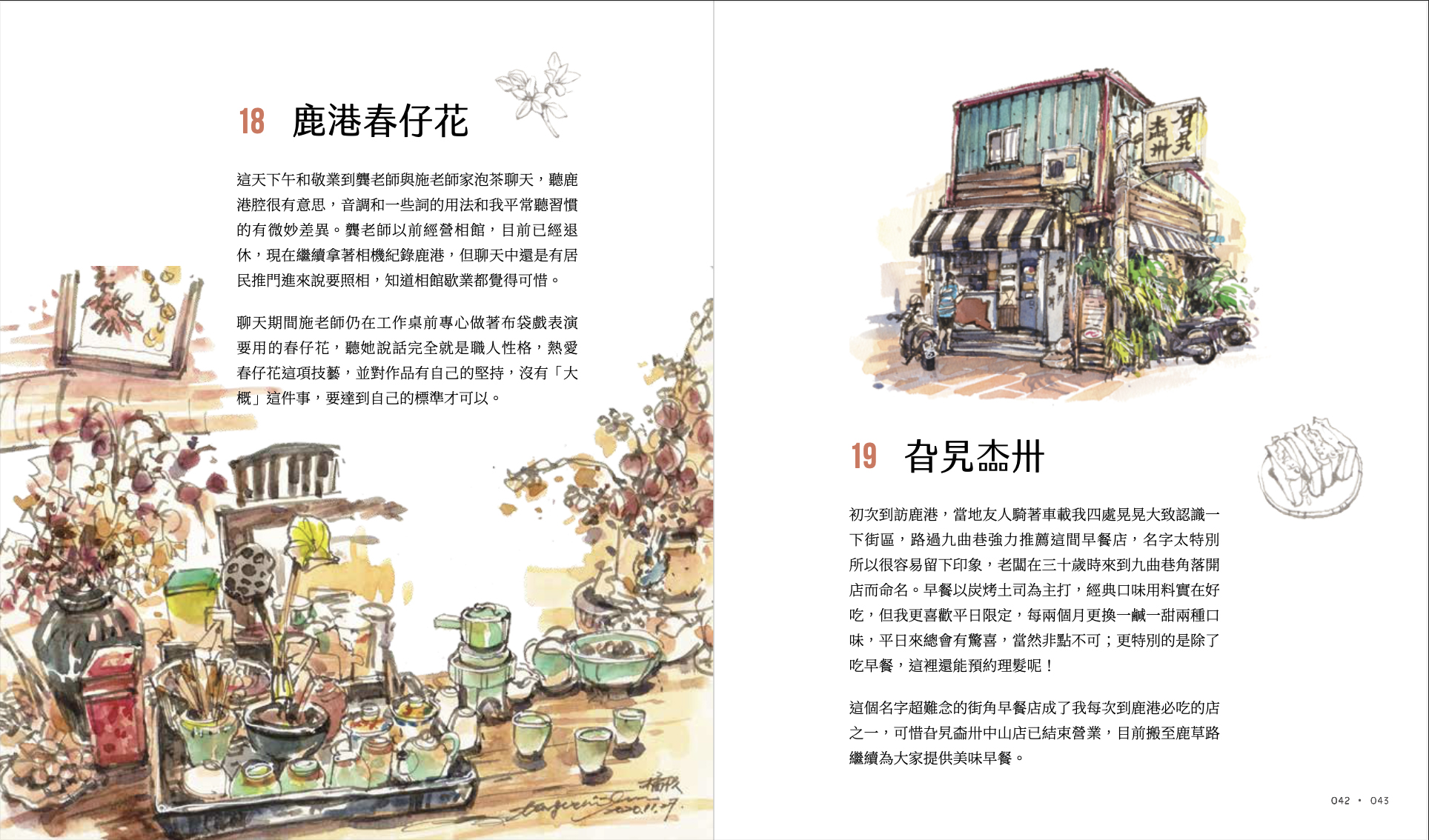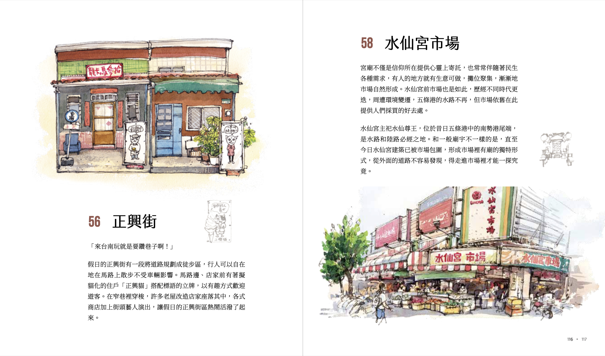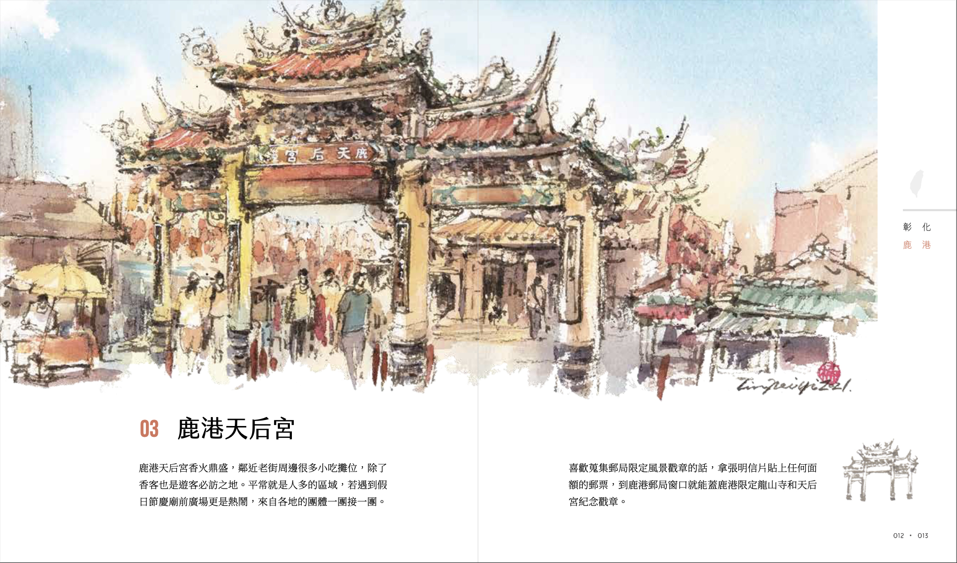 以手繪速寫的方式記錄旅行的日子,發現各種台灣文化在日常的體現老街、舊城、古屋、市場、寺廟等,分享市井中的台灣味!