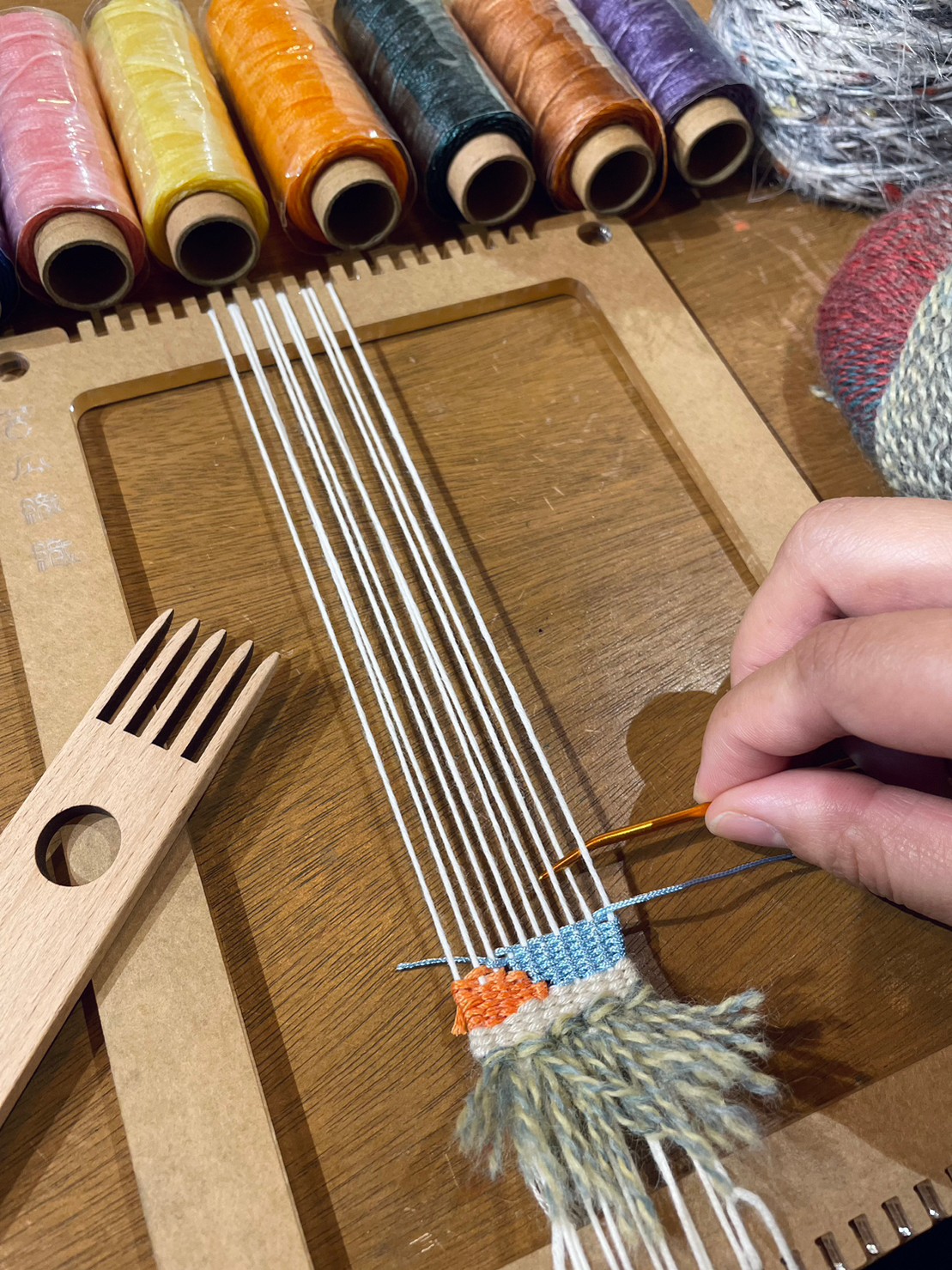 體驗活動、現場工具與耗材、完成作品約寬4 cm x 高25 cm~ 30 cm,如需把織框帶回家,優惠加購價$850,織框尺寸長22 x 寬16cm 可以織至寬度12cm,長度17.5cm(±2)