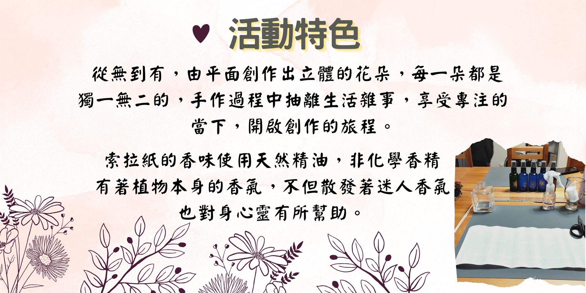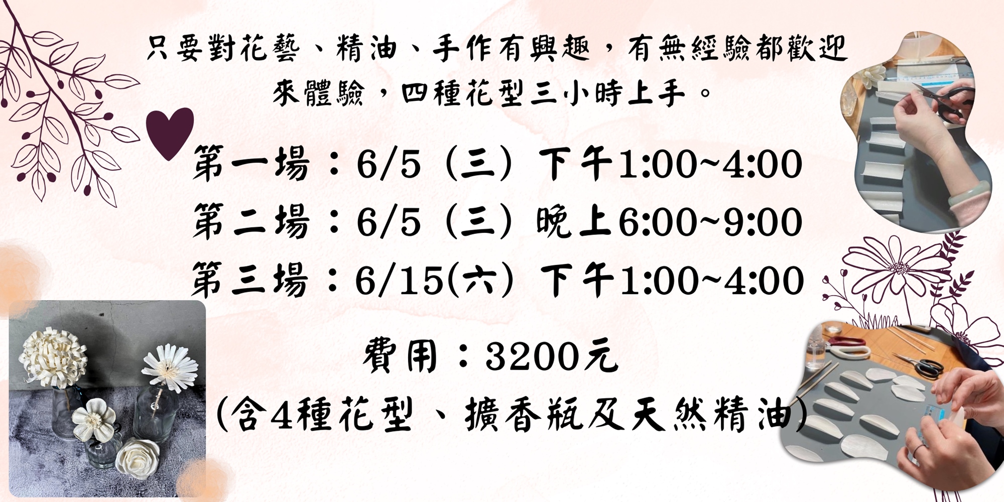 活動費用:3200元(含4種花型、擴香瓶及天然精油)