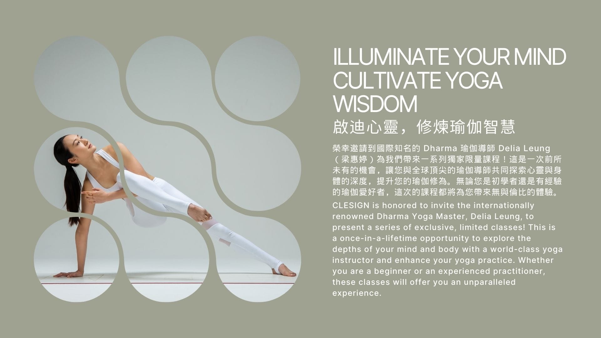 親愛的瑜伽愛好者們,這是您不容錯過的機會!CLESIGN 特別邀請全球瑜伽界傳奇人物 Sri Dharma Mittra 的嫡傳弟子,國際知名瑜伽大師 Delia Leung 親自授課。這次活動包括兩場獨特課程: