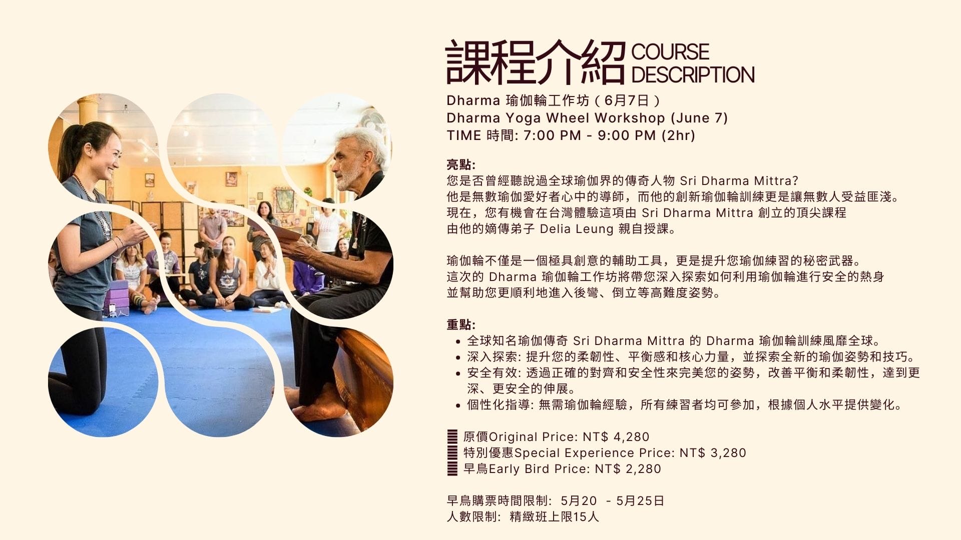 瑜伽輪不僅是一個極具創意的輔助工具,更是提升您瑜伽練習的秘密武器。這次的 Dharma 瑜伽輪工作坊將帶您深入探索如何利用瑜伽輪進行安全的熱身,並幫助您更順利地進入後彎、倒立等高難度姿勢。