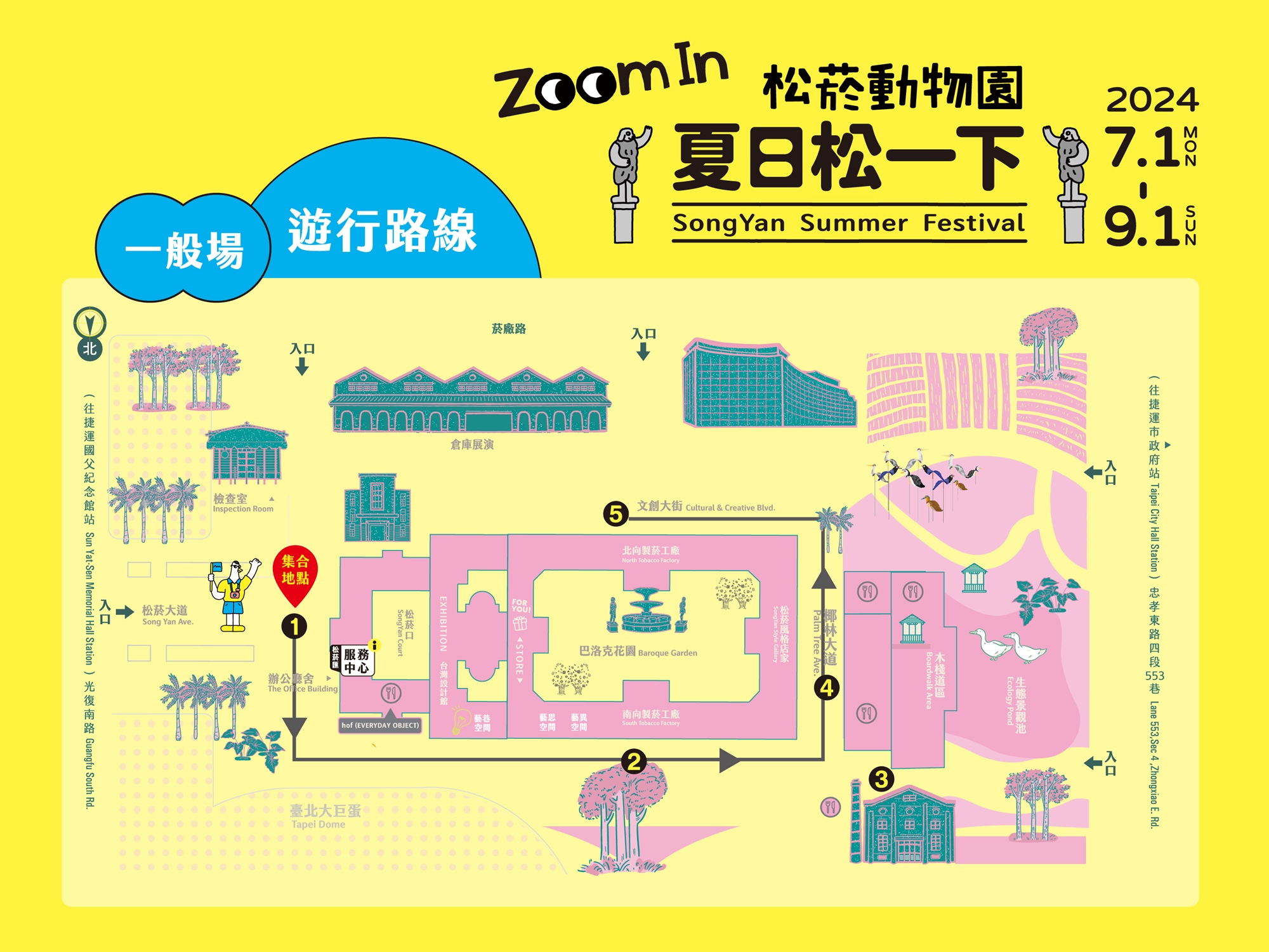 今年「夏日松一下」以「Zoom in 松菸動物園」為主題,首度與臺北市立動物園共同合作,在園區內把動物放大成夏日限定裝置,並拉近你我與動物的距離,於7/01~9/01推出今夏限定光影Party動物遊行、Zoom In Art夏日限定裝置、Taipei Zoo In集章任務等多元豐富的內容,邀請大小朋友一起嗨翻整個夏天!