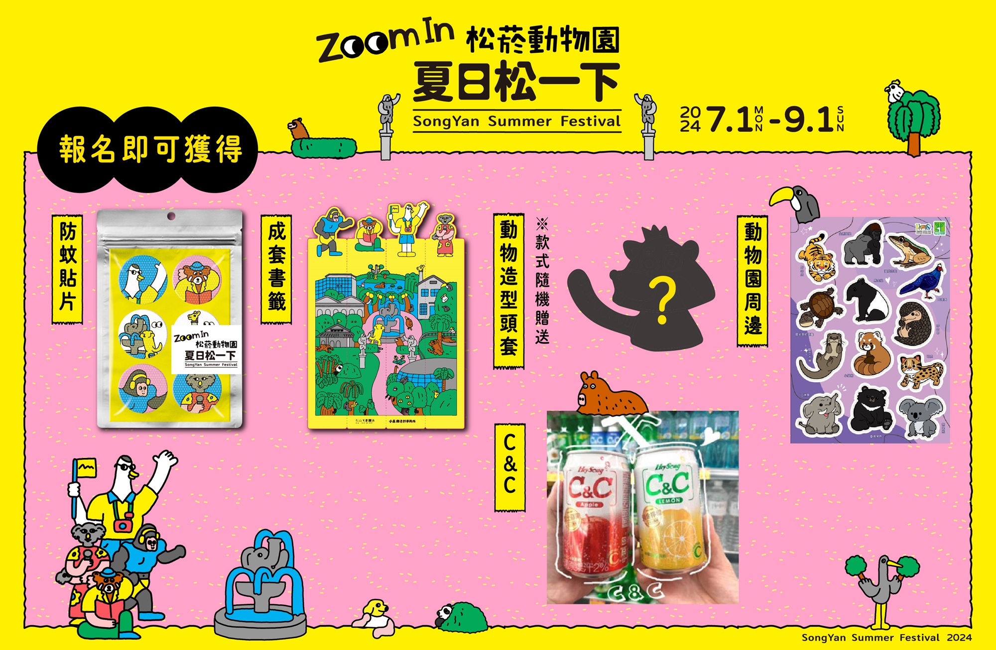 光影Party動物頭套、夏日松一下防蚊貼、夏日松一下書籤、臺北市立動物園110周年貼紙、黑松C&C飲品。