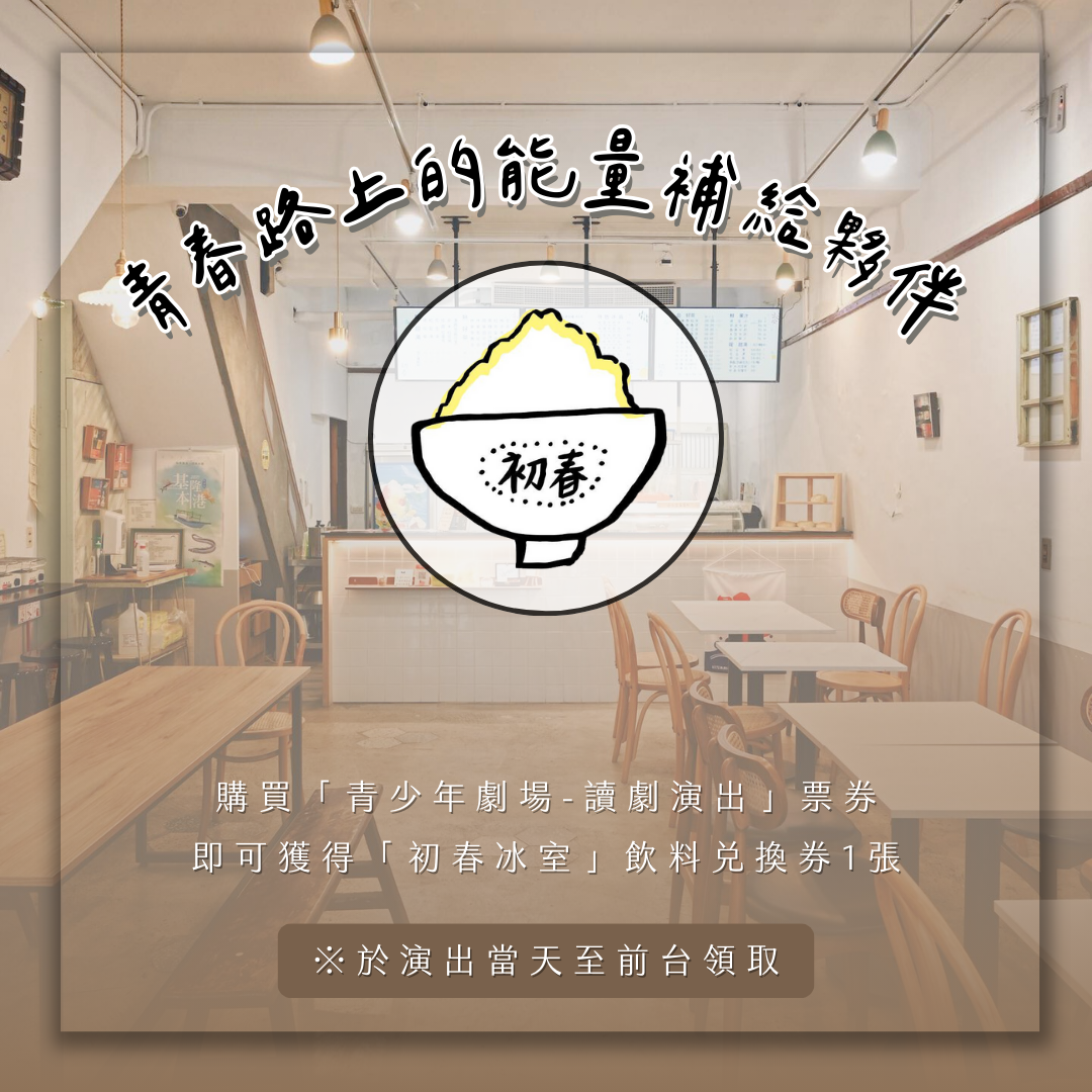 凡購買「青少年劇場-讀劇演出」票券,一張票券可於演出現場前台兌換「初春冰室飲料兌換券」一張,憑券可於8月底前至初春冰室兌換50元等值飲料一杯。