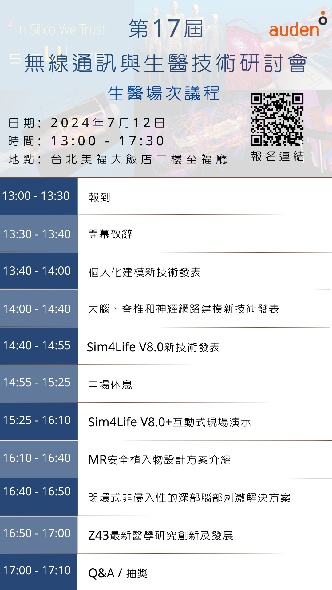 - 生醫場次:介紹計算生命科學平台Sim4Life V8.0的最新發展以及互動式的現場演示,以及MRI/植入物安全性評估量測方面的最新成果。也會針對S4L用於個人化建模:大腦、脊髓和神經網絡和非侵入式腦電刺激應用的最新進程進行介紹,此外也會分享瑞士最新醫學研究創新及發展內容。