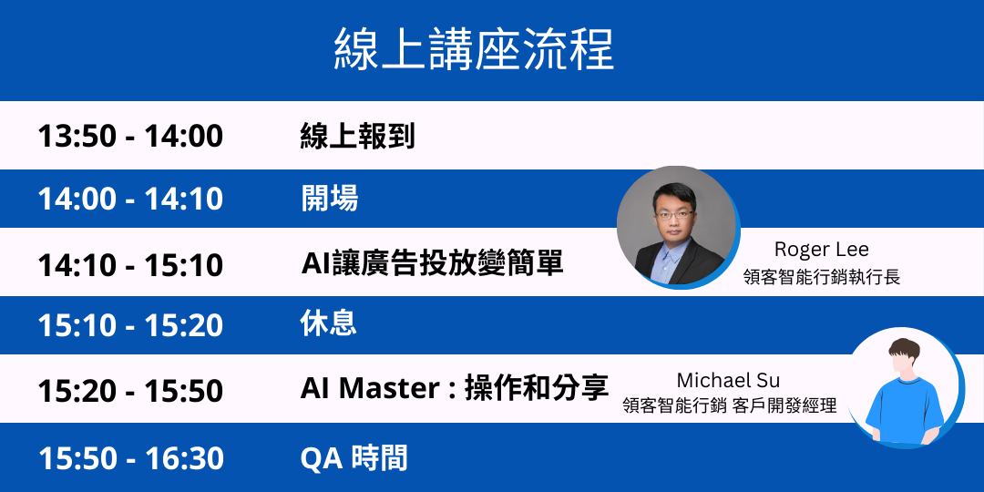 透過本次講座,Roger 將分享如何運用AI技術,導入廣告投放輕鬆提升營收和市場競爭力。