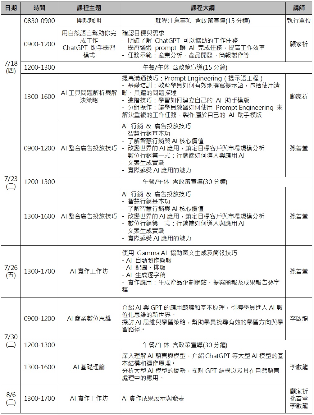 授課日期:7/18(四)、7/23(二)、7/26(五)、7/30(二)、8/6(二)