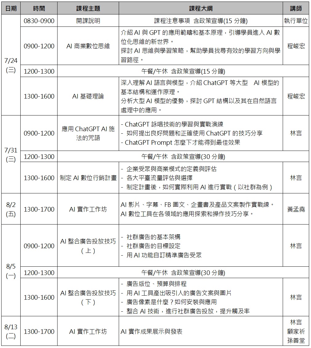 授課日期:7/24(三)、7/31(三)、8/2(五)、8/5(一)、8/13(二)