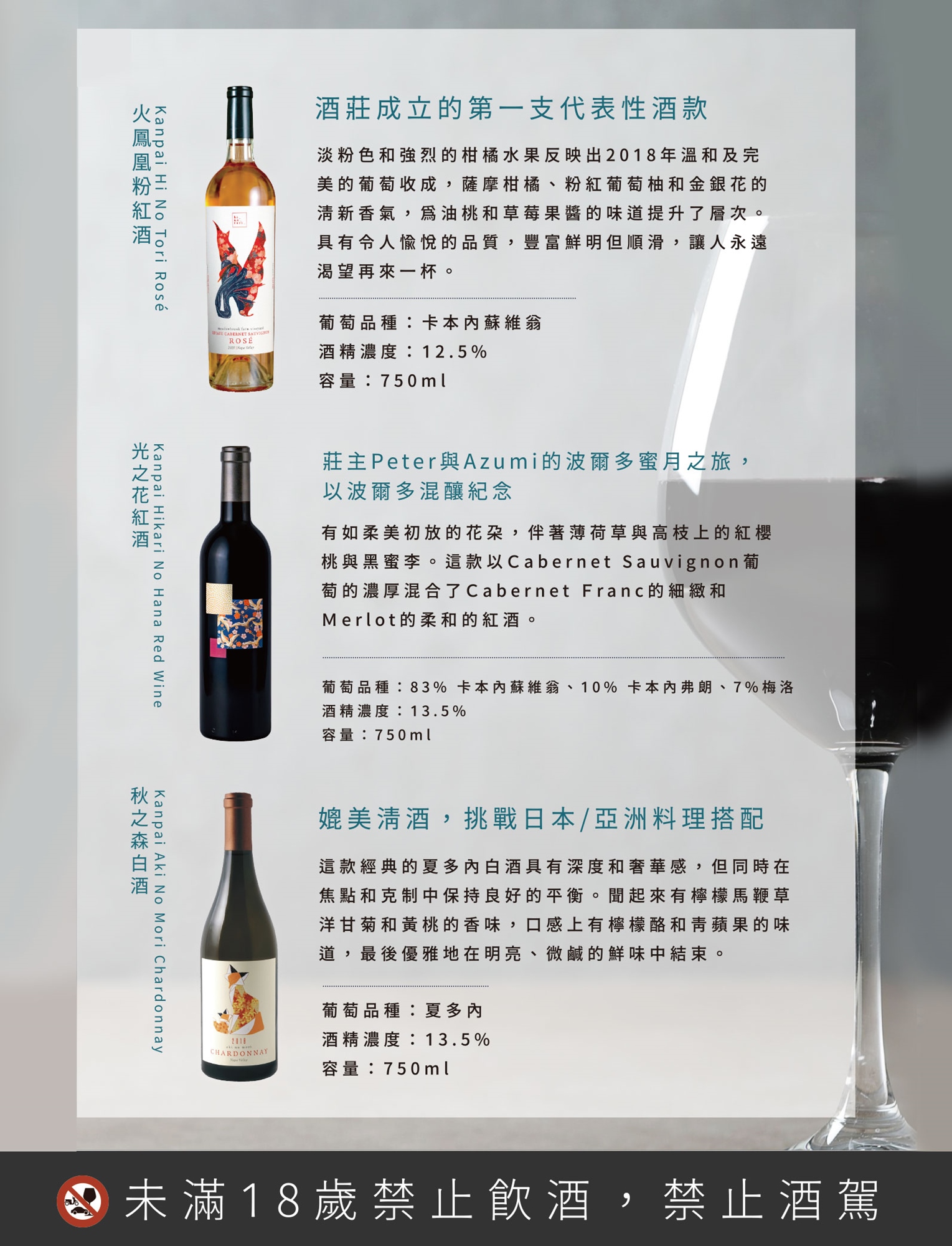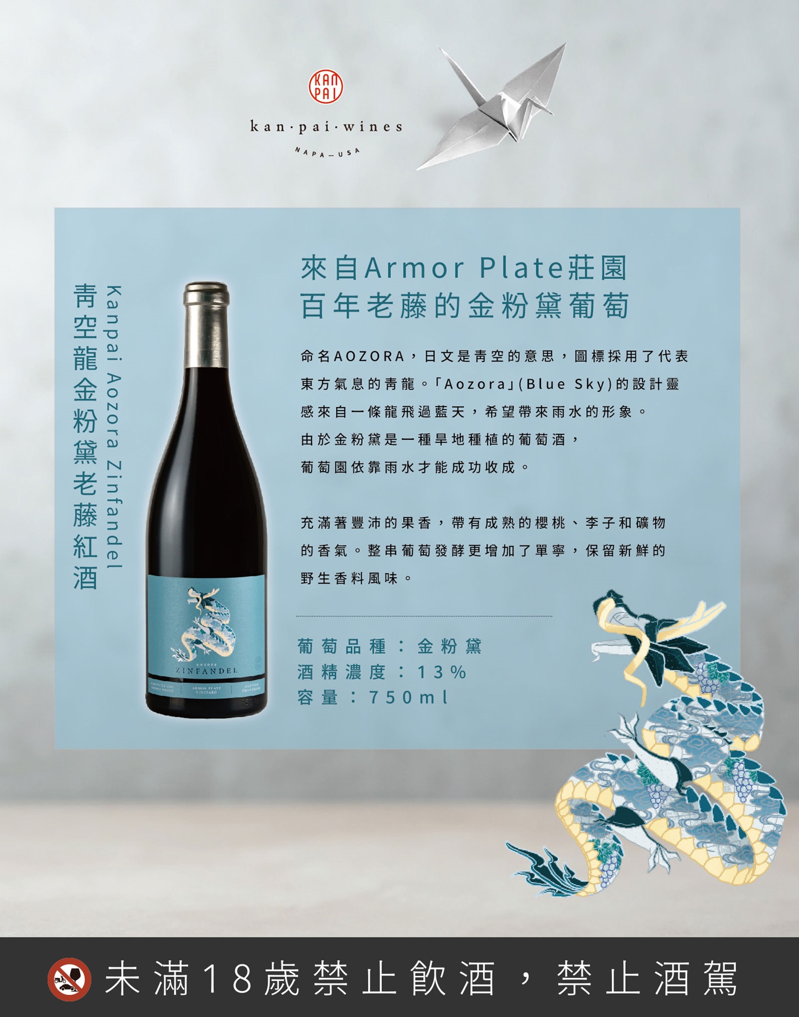 新世界產區中,美國葡萄酒具有領導地位。而納帕河谷葡萄酒僅佔美國4%產量,珍稀程度讓價格逐年飆漲,極具收藏價值。從美國葡萄酒歷史談起,到「加州葡萄酒之父」Robert Mondavi 羅伯蒙岱維,獨具慧眼說服梅朵布魯克莊園前莊主Ron Birtcher,種下第一顆卡本內蘇維濃植株開始。到2017年精品酒莊-Kanpai Wines加州乾杯酒莊品牌的誕生,細緻的「新加州釀酒風格」,足以媲美歐洲產區頂級葡萄酒。此品酒會能夠一次品嘗到龍年珍稀限定版-青空龍金粉黛紅酒。