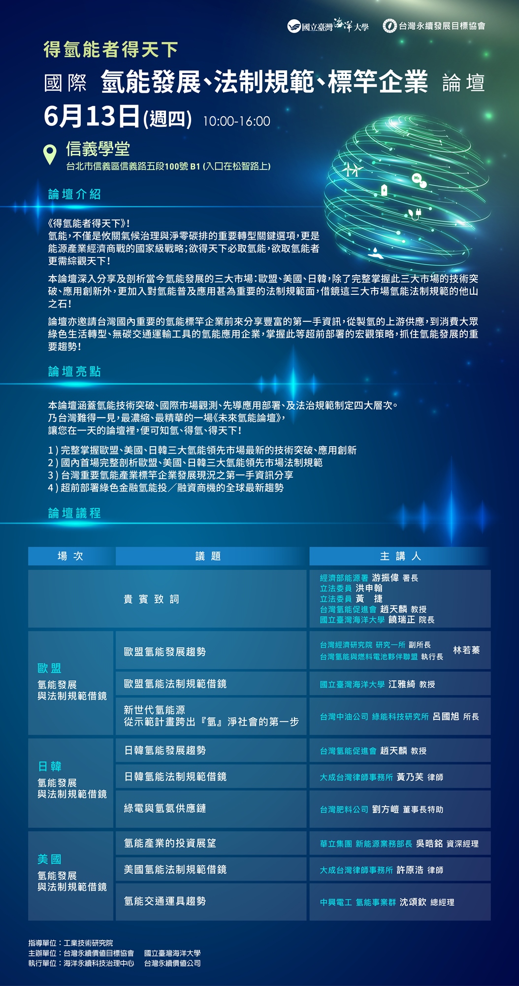 本論壇深入分享及剖析當今氫能發展的三大市場:歐盟、美國、日韓,除了完整掌握此三大市場的技術突破、應用創新外,更加入對氫能普及應用甚為重要的法制規範面,借鏡這三大市場氫能法制規範的他山之石!