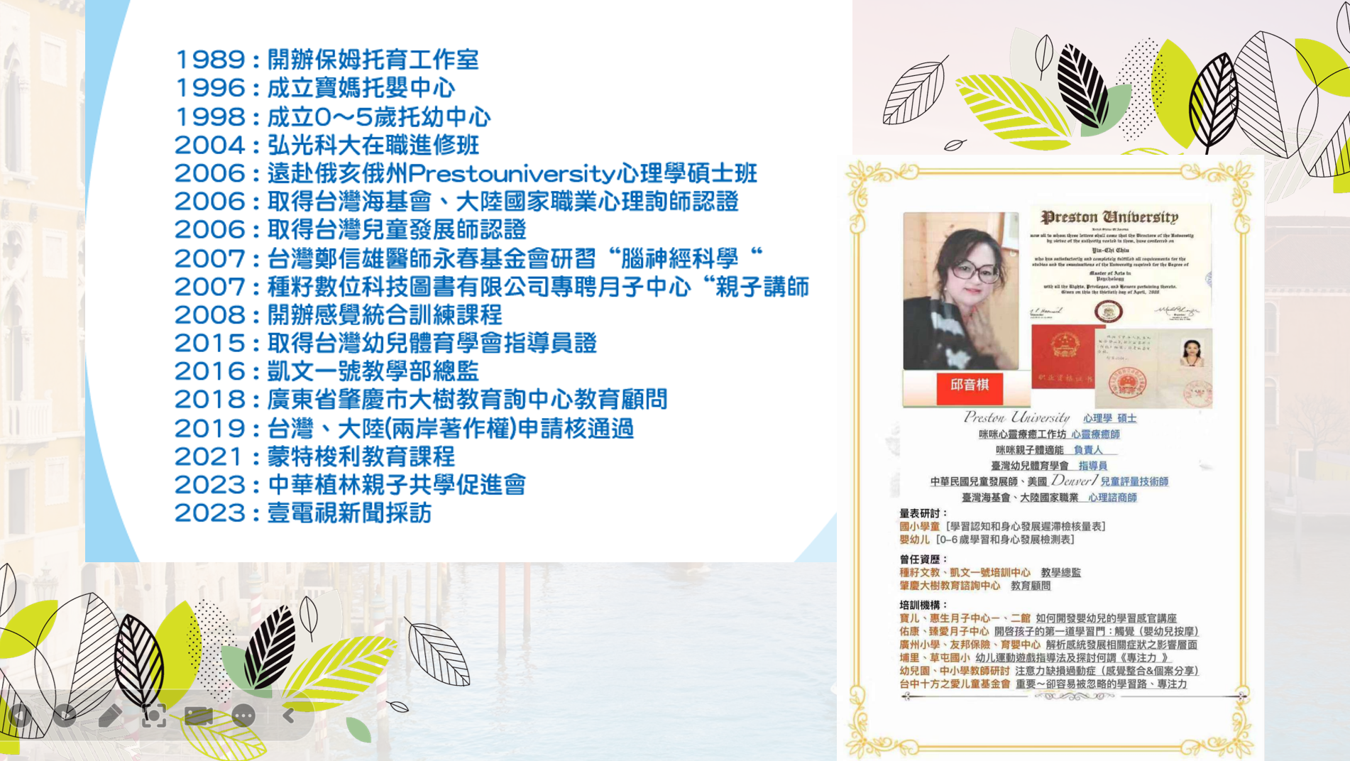 我們很榮幸邀請到這位擁有十年商業企劃經驗的先生,現任兗一新創國際行銷的執行長,來講授親子共學體感教育課程。他致力推動企業的ESG(環境、社會、公司治理)發展,並擁有豐富的多領域經歷。曾任同濟會中山會46屆會長,並支持中華植林親子共學促進會。作為特約講師,他在多所大學任教,並參與非洲國際義工項目。此外,他在東森電商組織擔任重要職位,擁有豐富的財商和媒體專業知識。這位講師將以其廣泛的專業背景和實踐經驗,為我們帶來深入的親子共學體感教育講座,助您和您的孩子一起學習成長,共同開創美好未來。