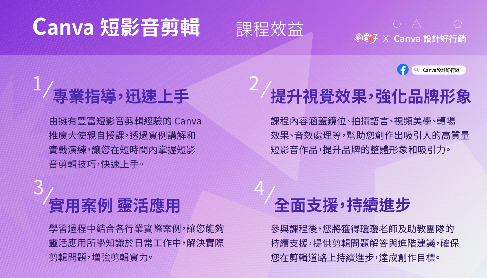 提升短影音剪輯技巧,讓Canva推廣大使瓊瓊老師帶您無痛入門、快速上手!瓊瓊老師為專業設計師出身,具有豐富的視覺設計經驗和數位社群實戰經驗,並兼任創點子媒體設計總監及Canva台灣推廣大使。如果您覺得即便會用Canva,但在製作短影音時總是感到力不從心,這門課是專門為您預備的!我們以Canva軟體平台為基礎,傳授老師多年來累積的剪輯經驗,幫助您提升影片製作能力,打造吸睛、專業的短影音。