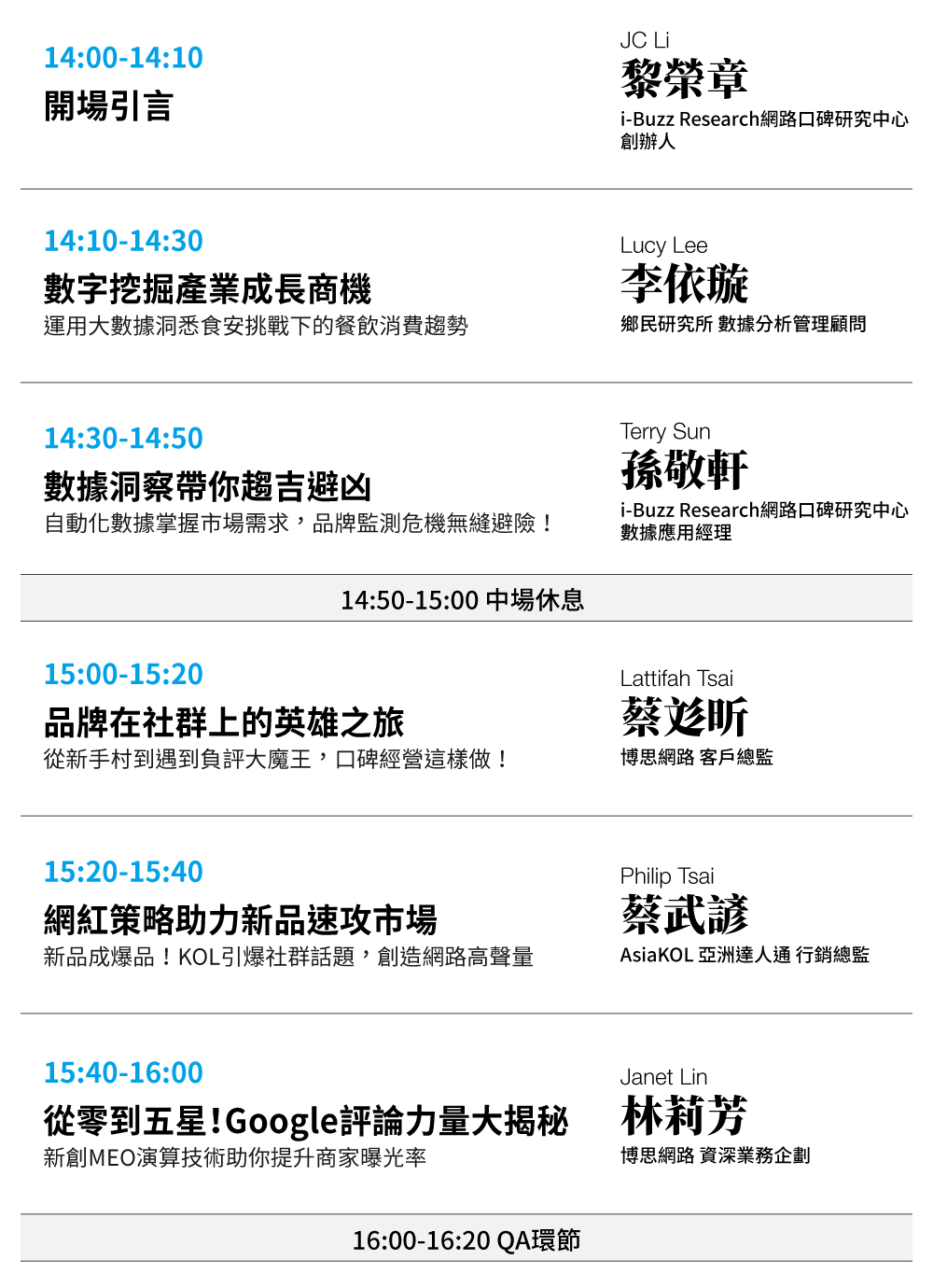 - 講座專門針對在職工作者舉辦,名額有限,主辦方將保留審核權,以提升現場交流互動之品質,報名須收到i-Buzz Research官方通知信方視為報名成功。