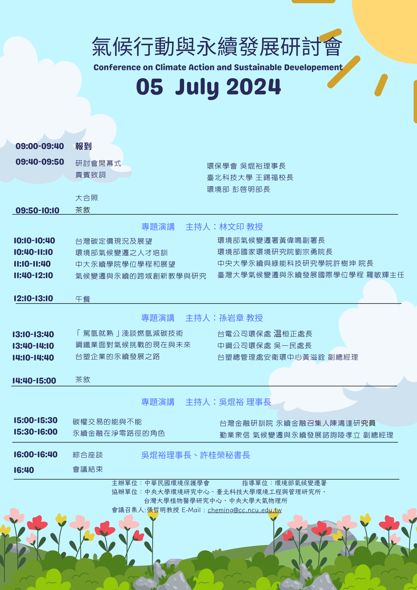 淨零碳排已是全球趨勢,中華民國環境保護學會謹訂於民國113年7月5日(星期五)舉辦「氣候行動與永續發展研討會」,特於集思北科大會議中心-感恩廳,邀請產、官、學、研專家,針對相關議題做專題演講和座談,歡迎相關學者專家及業界和有興趣人士踴躍參加。