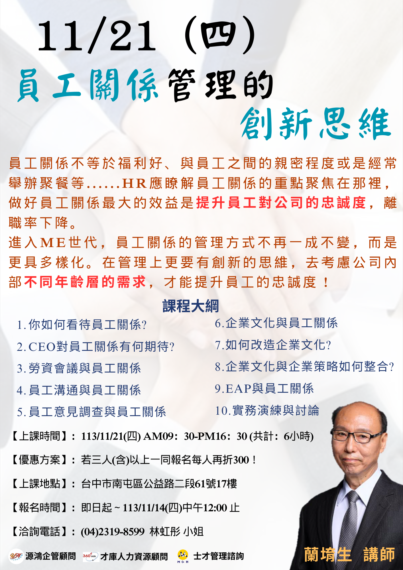 【上課時間】:113/11/21(四) AM09:30-PM16:30 (共計:12小時)