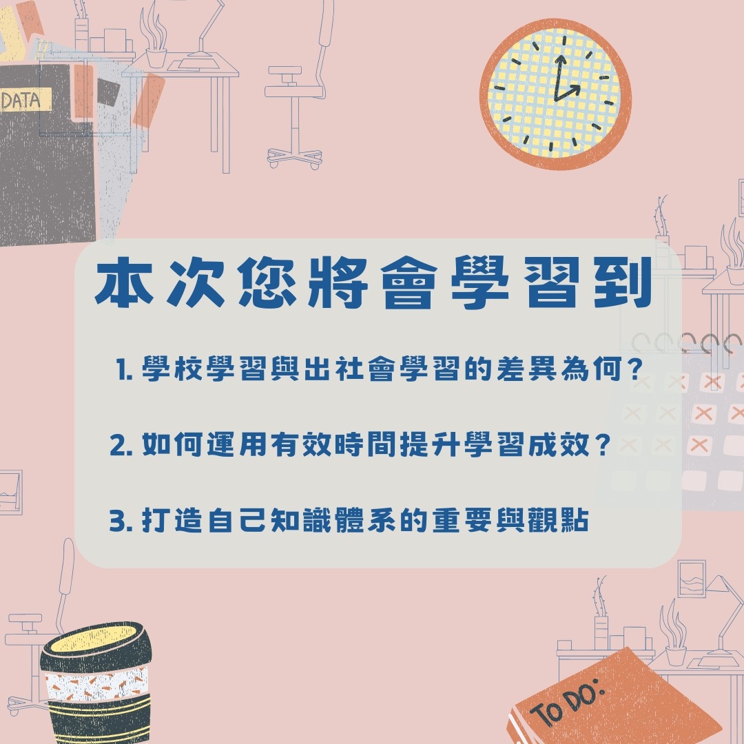 出社會後學習和以前在學校的學習,有感到哪裡不一樣嗎?再也不會有老師或教授關心我們是否能夠考好成績而學習,以前學生時期為了考試升學,要學的內容已經夠多了,本以為出社會之後就可以脫離學習苦海,沒想到一出社會才發現處處都必須要學習,不管事本業內的學習、本業外的精進,再加上線上課程的多元化,時間有限的情況,應該怎麼有效學習…
