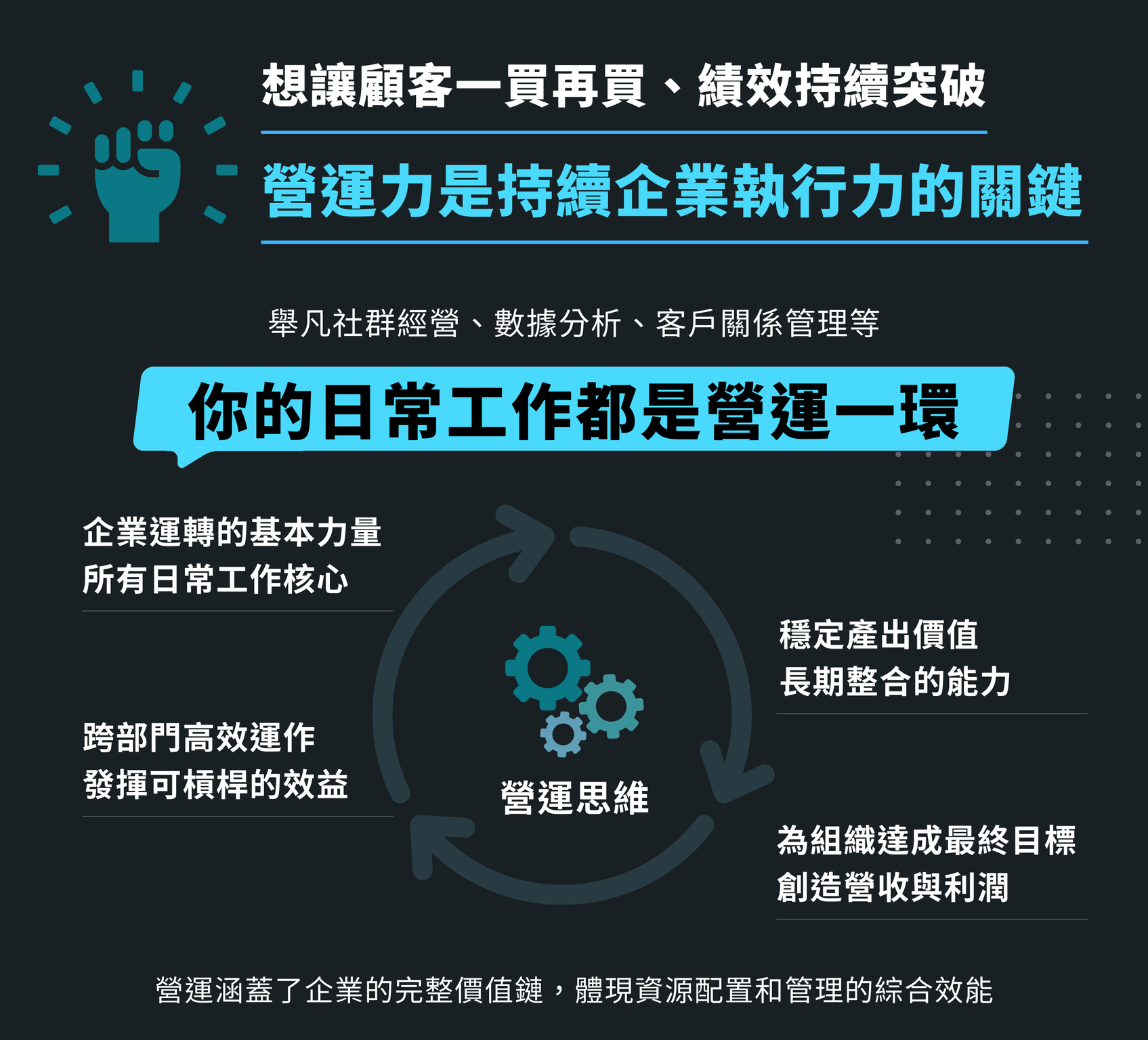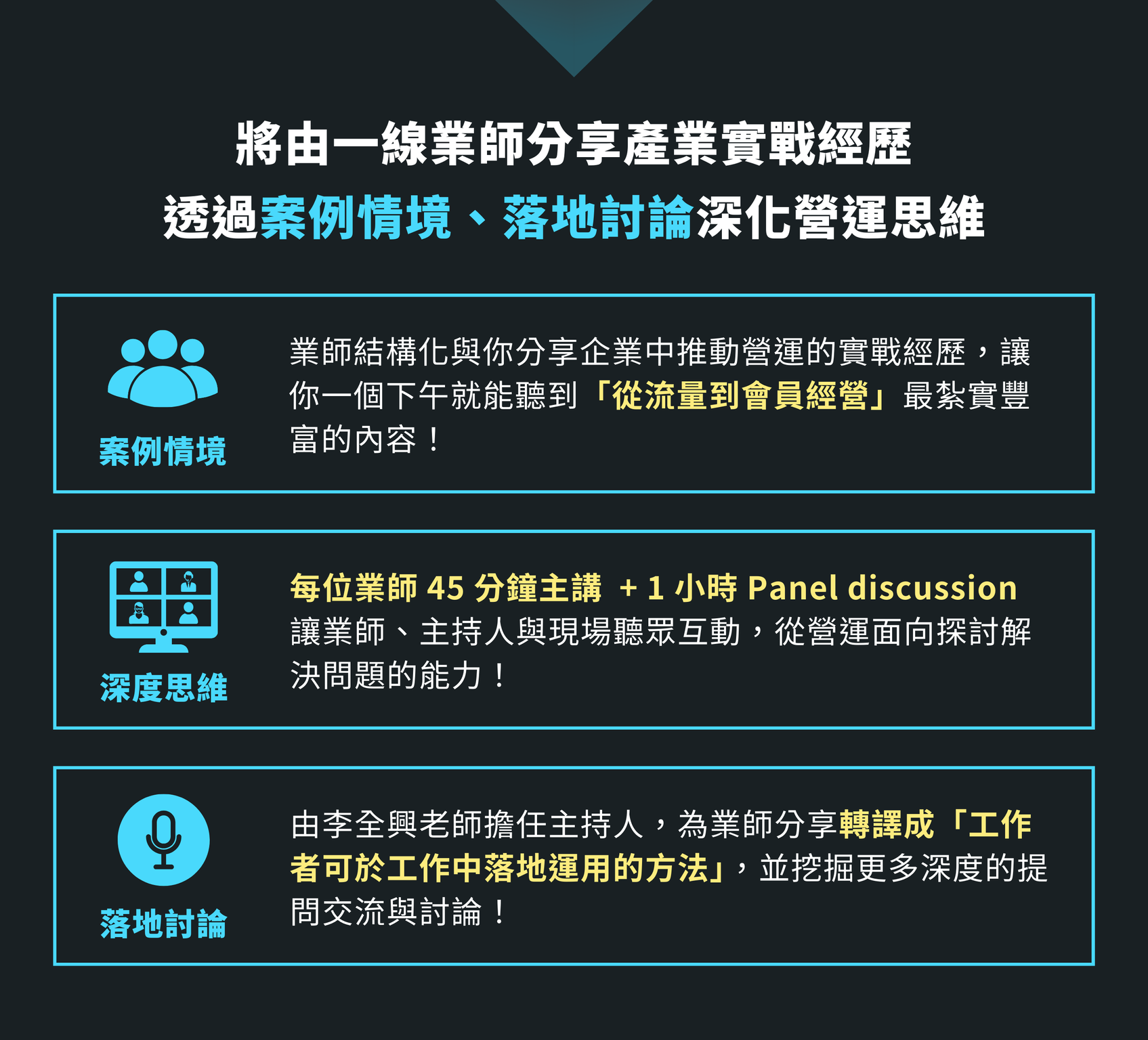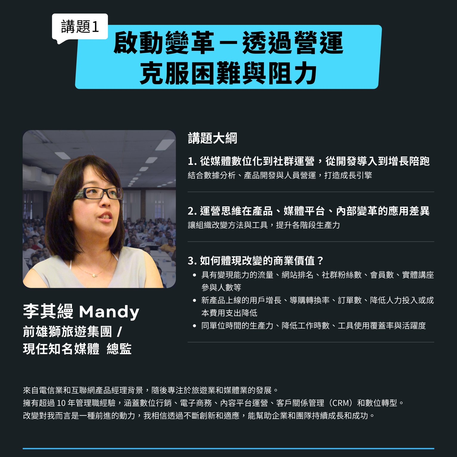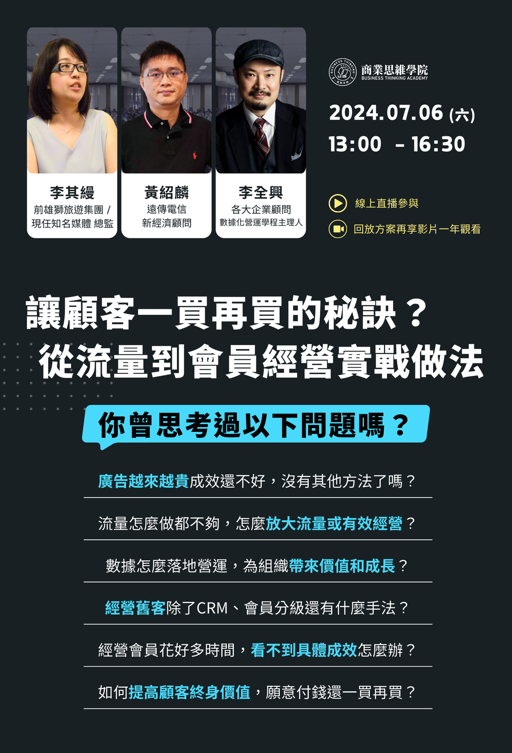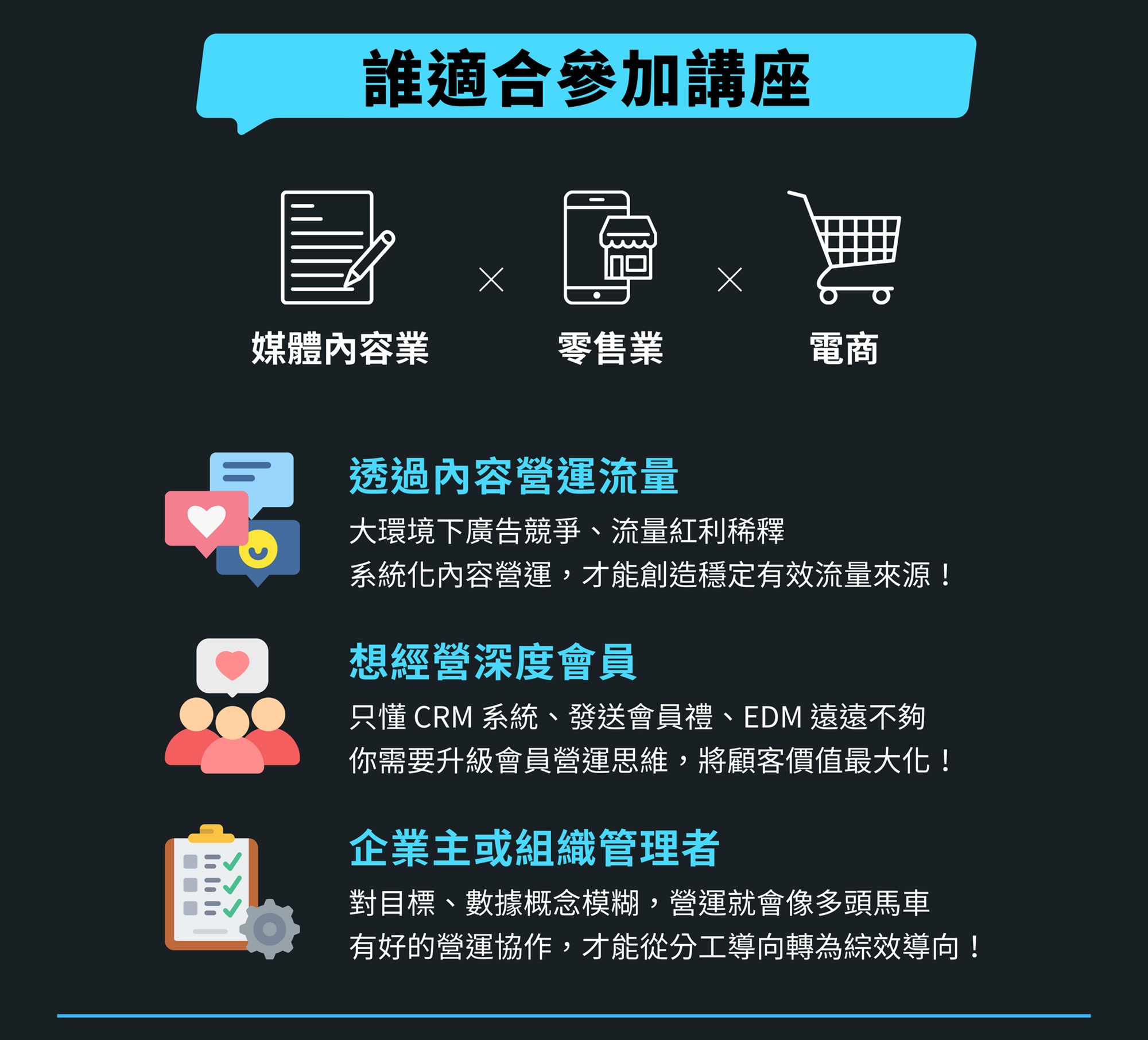 包括企業主、各部門主管、行銷人員、產品經理、營運管理、專案經理等,希望了解營運如何發揮綜效,讓組織達成營收增長、解決問題創造商業價值的人。