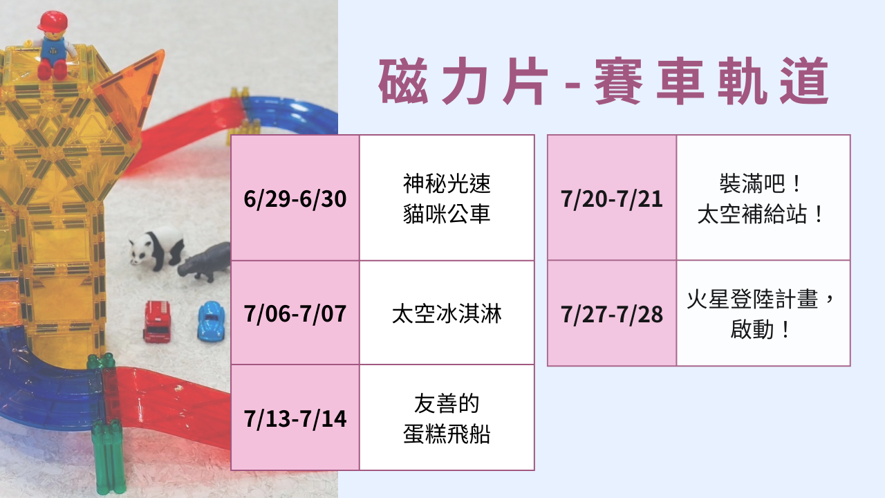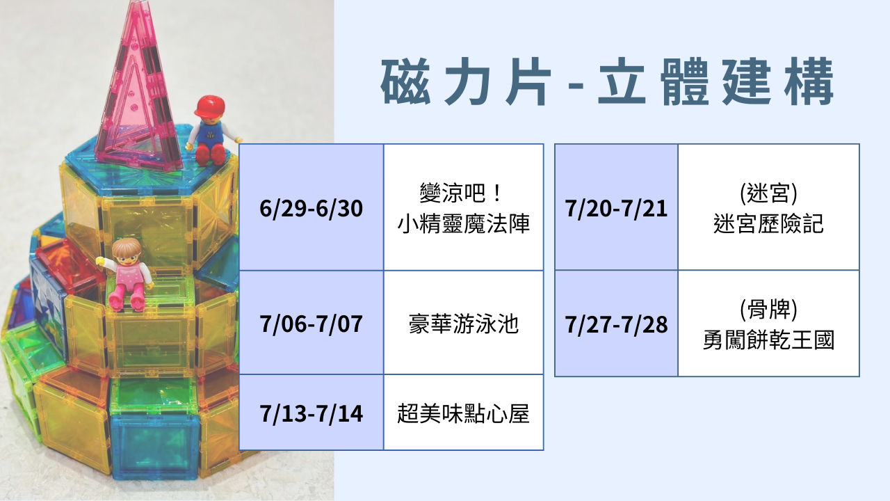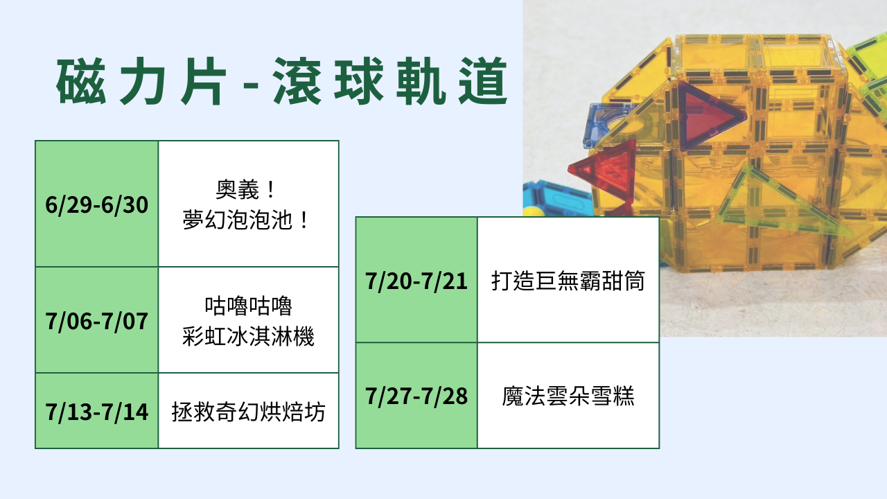 1. 「磁力片建構教室」可更換時段至尚有名額的同系列同價位課程,更換次數限1次,如皆額滿恕無法更換,票券可轉讓他人使用。