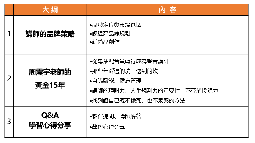 馬老師將在這場講座中分享周震宇老師的講師品牌經營、開課、理財經驗,