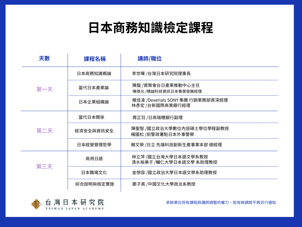 為了即將畢業的大學生、研究生,以及思考轉職的社會人士,規劃20小時的課程。並邀請國內知名日本研究學者,日商公司主管擔任講師。課程時間(含檢定)為3天(周六與周日)。結束後每位學員頒發課程修業證書。同時,現場將進行「日本商務知識檢定」,合格者將寄予檢定證書。