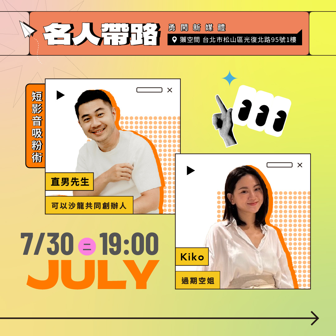 科技島全新跨月雙主題小聚《名人帶路 勇闖新媒體:短影音吸粉術》,壓軸場邀請到活躍於 YouTube 的「過期空姐 Kiko」和她的另一半「直男先生」,將分享如何運用詼諧幽默的互動、貼近粉絲的日常生活,串聯個人事業打造多元的商業合作機會。
