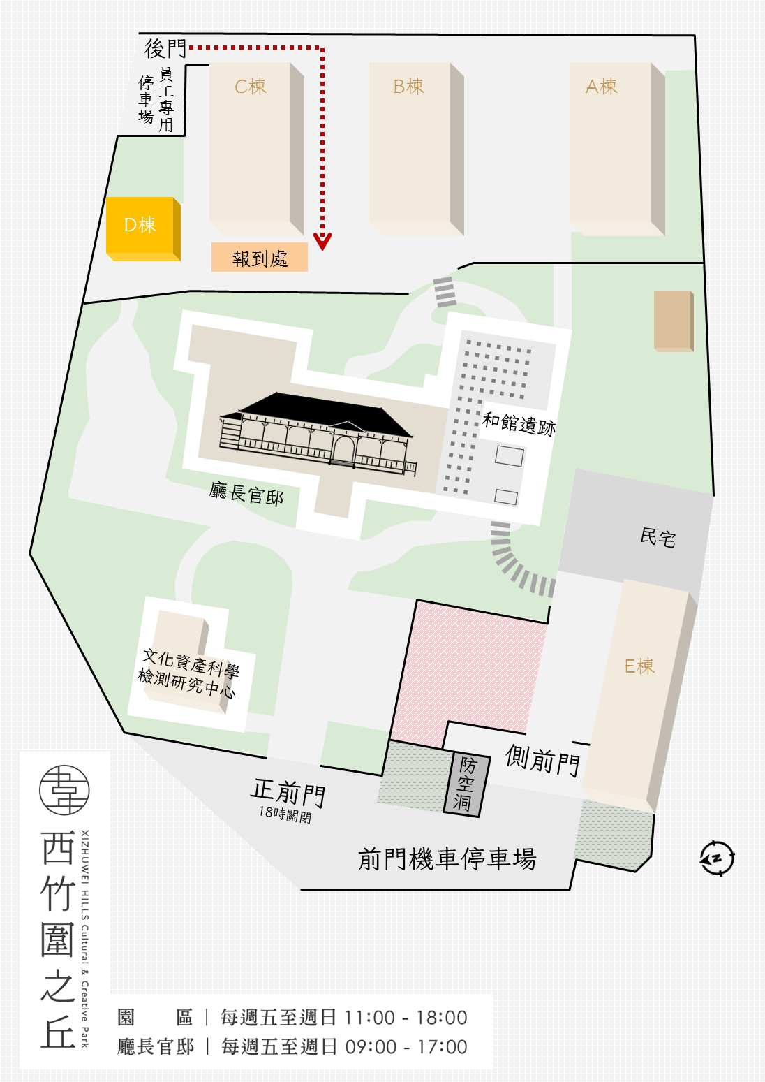 本次創作體驗設計為三個不同時段:清晨的鳥鳴、午前的喧鬧、深夜的靜謐,西竹圍特別夜間/清晨開放,用身體與歷史對話,在不同時段感受同一場地的不同氛圍。