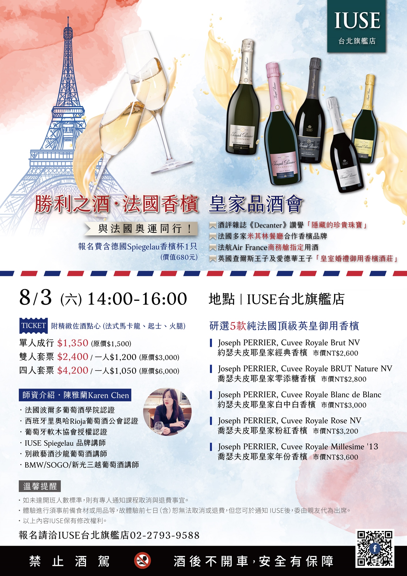 與法國奧運同行!IUSE推出「勝利之酒 ‧ 法國香檳 皇家品酒會」與大家遨遊法國世界!本堂特邀別緻藝酒沙龍Karen老師,將引領大家品飲5款純法國頂級英皇御用香檳,不僅是酒評雜誌《Decanter》讚譽「 隱藏的珍貴珠寶」,也是法國多家米其林餐廳合作香檳品牌和法航Air France 商務艙指定用酒,同時研選源自歐洲皇室御用水晶工匠打造,具有 德國五百年歷史的頂級酒器 Spiegelau 水晶玻璃葡萄酒杯品飲,將體驗提升更上一層的非凡品味!