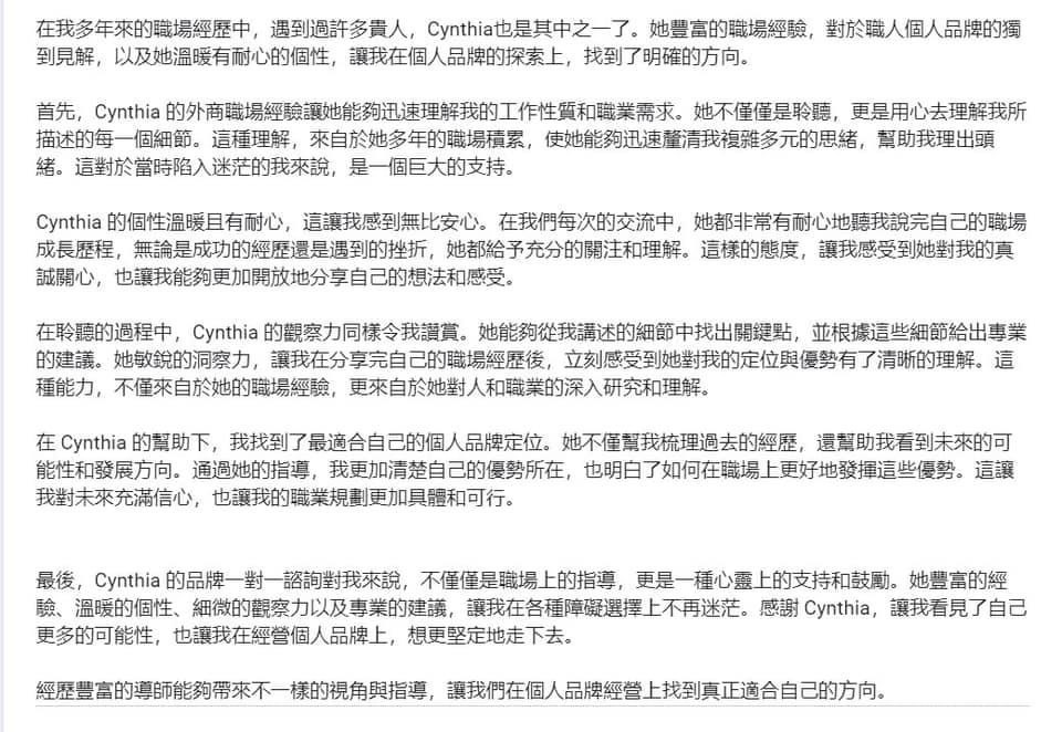 在粉專「不只是媽媽Cynthia」倡導透過個人品牌,讓生活每一天都能過成自己想要的樣子,讓自己每一天都能成為更喜歡的自己,邁向理想人生。組建「不只是媽媽」讀書會,協助更多想要自我實現和創業的媽媽們共學共好。期許幫助台灣更多中小企業和一人公司發展成長,讓台灣創業環境更多元豐富,提供下一代更多元的可能性發揮天賦。