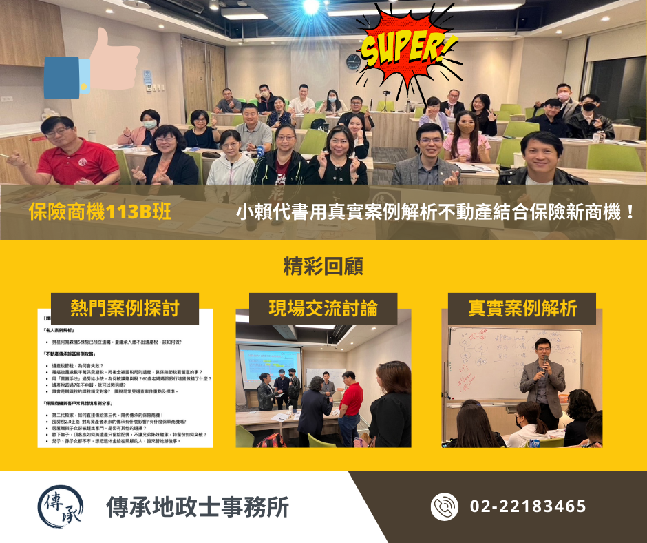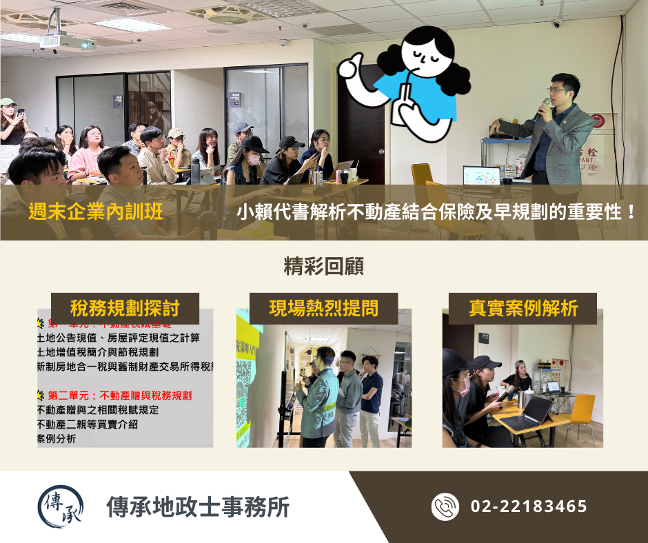 【授課講師經驗】華南金資產、星展銀行、信義房屋、賣厝阿明、富邦人壽、公勝保經、永達保經、富爾訊、嘉立富、大安社大、台北市仲介職業工會講師。