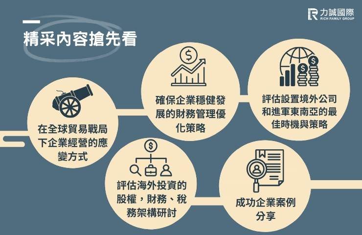 設置境外公司?前進東南亞?這些都很可能將是您企業下一步關鍵決策的選擇。我們誠摯邀請您參加我們的講座,探討企業必學的財務決策與進入東南亞市場的時機判斷。