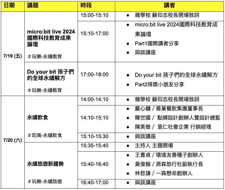 本次論壇將邀請Micro:bit Educational Foundation亞太地區的主管及亞洲傑出的micro:bit champion教育者們分享各地區科技教育成果,以及台灣學生們發表響應永續發展之智能創意作品。