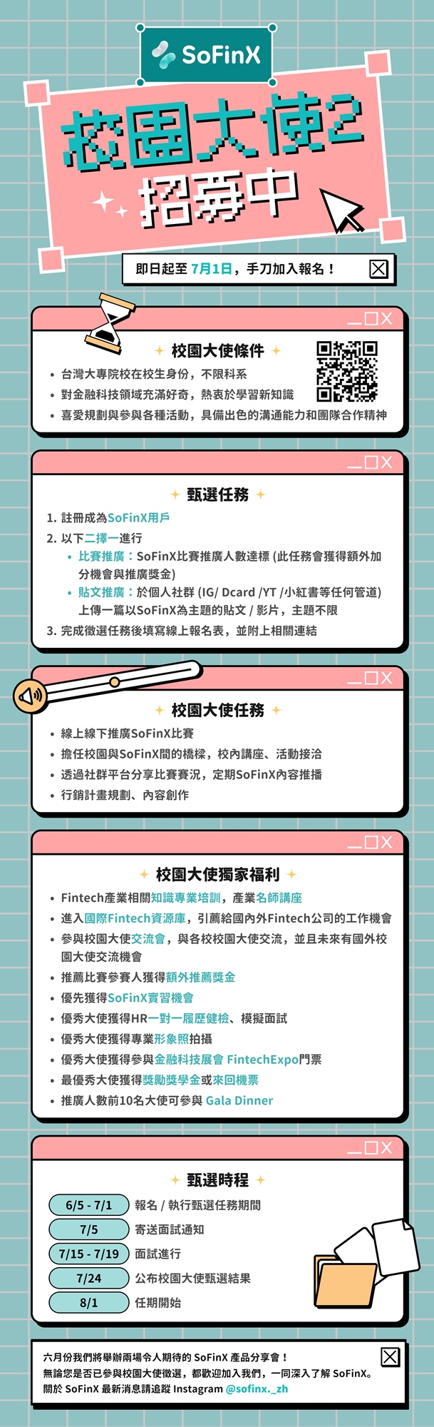 SoFinX 是 OTSO Fintech 所設計與研發的社群交易金融平台,發揮集合眾人之力,我們能一起跨過投資門檻的共享精神。這次的校園大使計畫,我們為你準備了豐富的機會,這不僅是一個可以直接與 SoFinX 的頂尖投資者、活動專家和金融業界精英面對面交流的絕佳機會,還是一場學習和成長的盛宴!