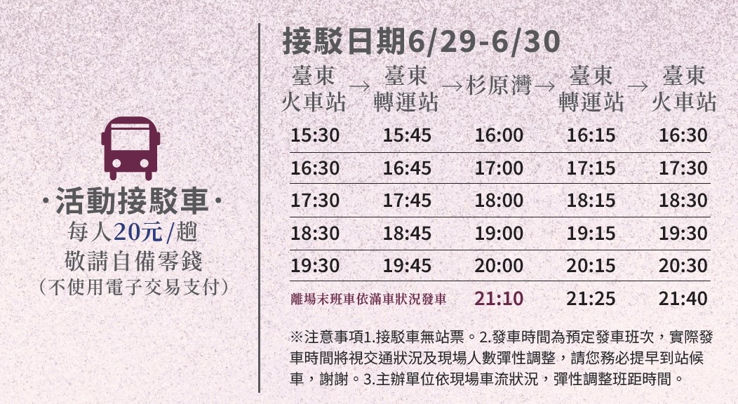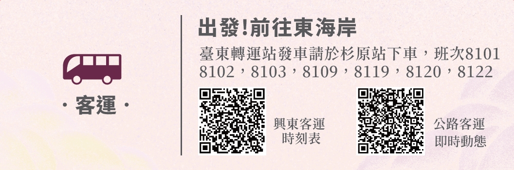 搭臺鐵至臺東轉運站下-轉搭興東客運至杉原站下。