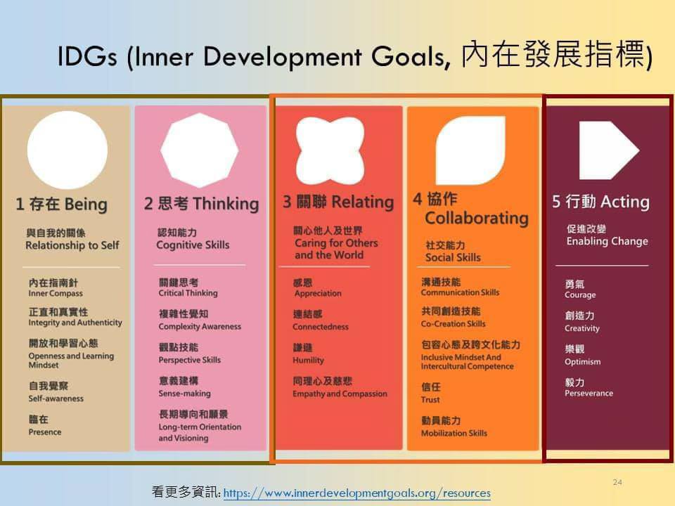 2020年IDGs組織以提昇人的各種內在能力為目標。涵蓋「Being與自我的關係」、「Thinking認知能力」、「Relating關心他人及世界」、「Collobarting協作」與「Acting促進改變」共5大面向,包含『信任 、複雜性覺知、溝通技能 、連結感、同理心及慈悲、勇氣、自我覺察、感恩、開放和學習心態 、內在指南針…等23種』關鍵轉型能力。