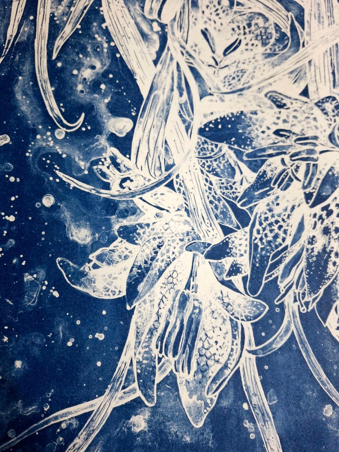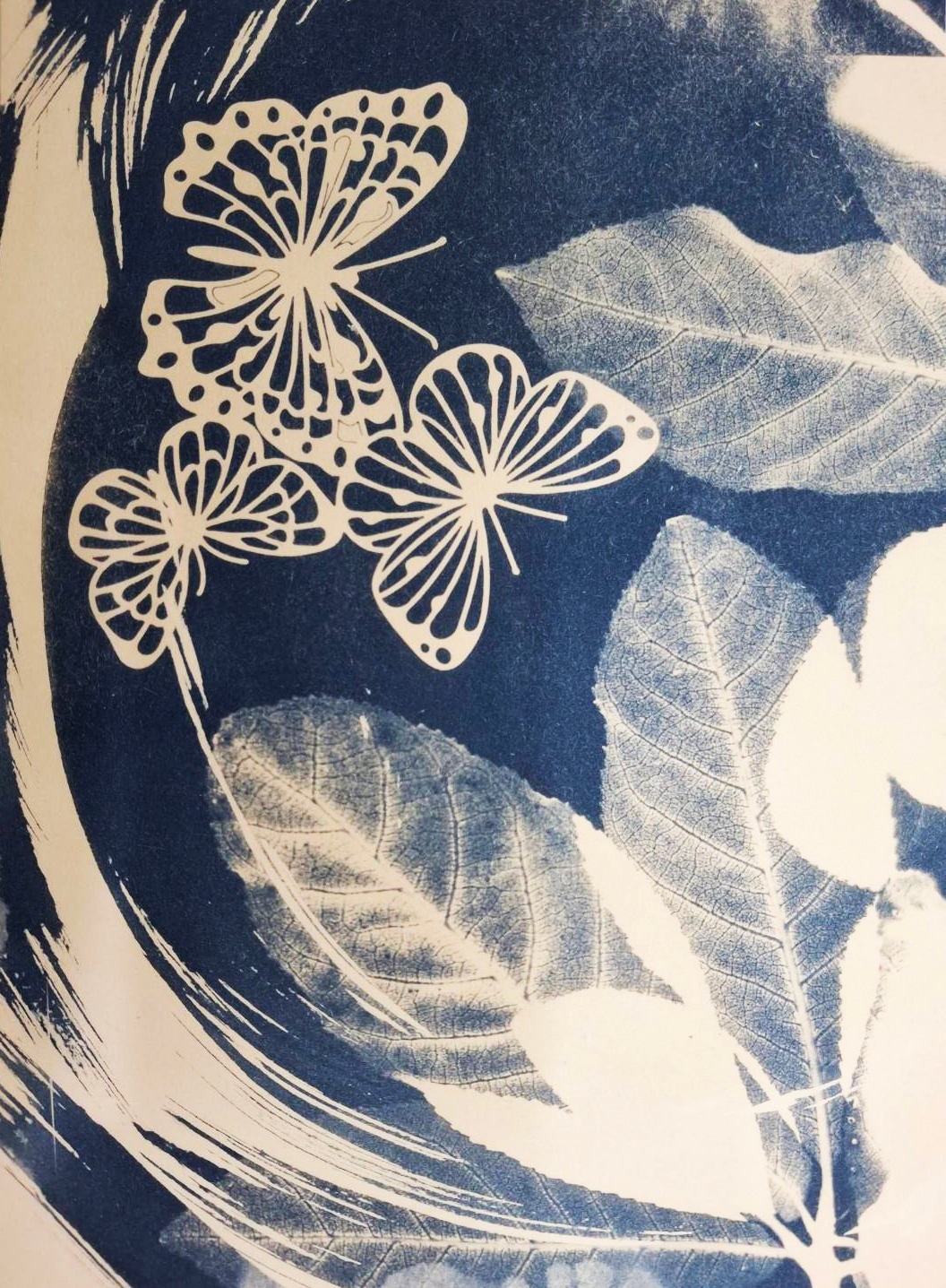 藍晒是一種古老的顯影術,因為它必須以陽光照射,並以最終呈現藍色影像而得名。由於成份裡頭含有「氰」,所以也有人稱它為氰版,可說是我們目前最容易學習的「非銀鹽攝影工藝」,其配方與創作方式並不難,沒接觸過的學員也都能輕易學習並操作。藍晒創作完成的圖畫充滿深邃的普魯士藍與純白的線條,見過的人都為它深深著迷。