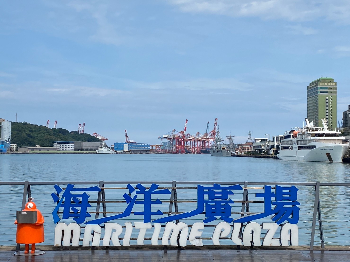 ✅在「海洋廣場」欣賞優美港景,遠望豎立在虎仔山的基隆地標。