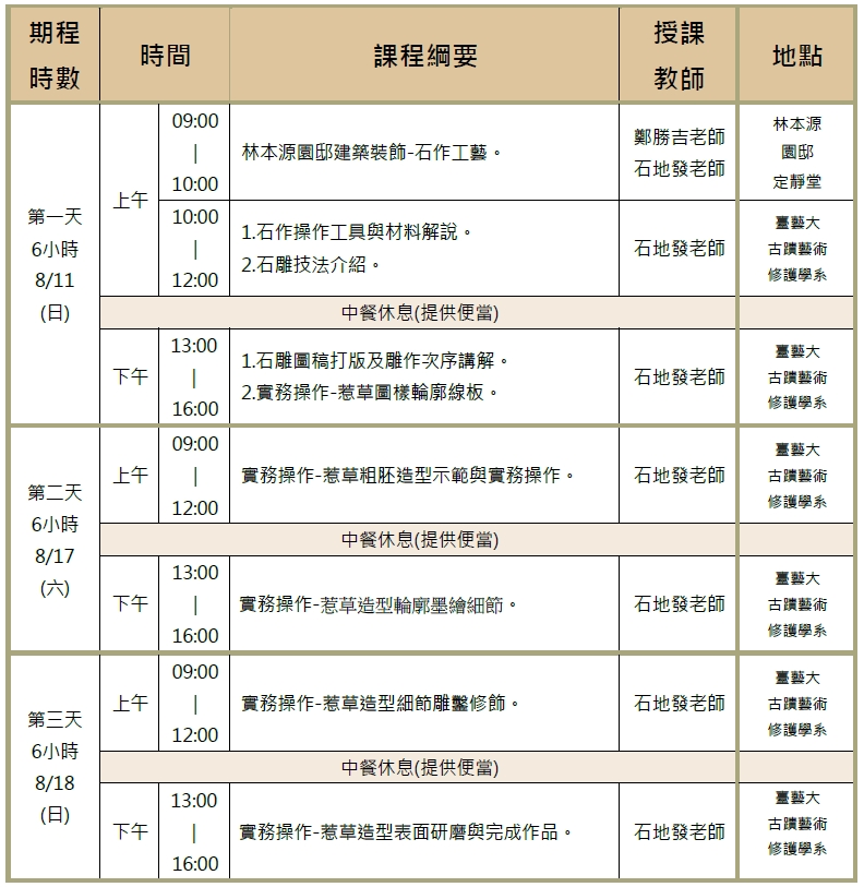 傳統石作工藝之研習課程於8月11日(日)、8月17日(六)、8月18日(日)共計3天舉辦。本次石作工藝課程,內容包含「認識石作技藝工法與工序」、「石雕工具之製作」等兩大重點。