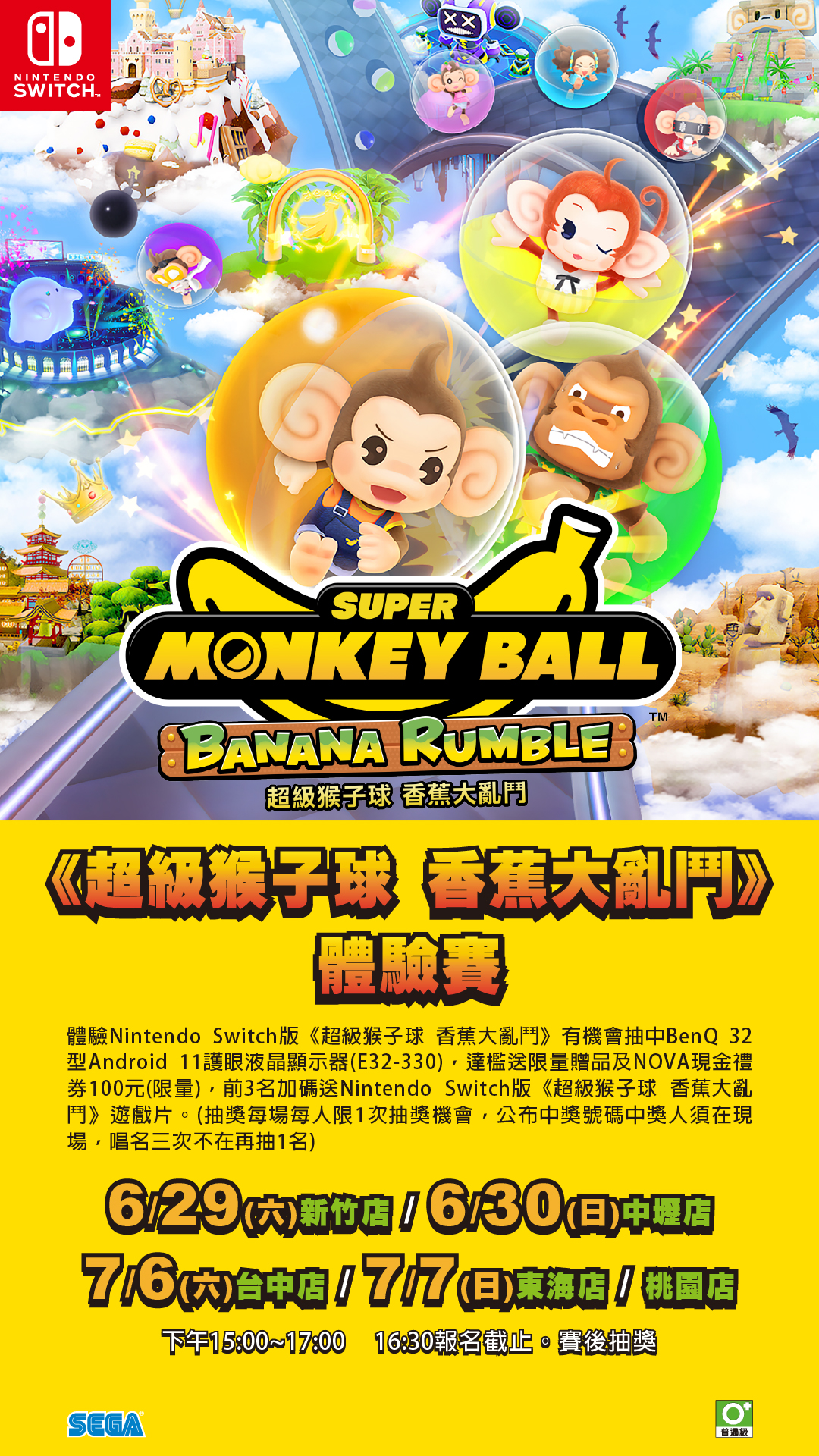 體驗Nintendo Switch版《超級猴子球 香蕉大亂鬥》有機會抽中BenQ 32型Android 11護眼液晶顯示器(E32-330),達檻送限量贈品及NOVA現金禮券100元(限量),最快優勝前3名加碼送Nintendo Switch版《超級猴子球 香蕉大亂鬥》遊戲片。(抽獎每場每人限1次抽獎機會,公布中獎號碼中獎人須在現場,唱名三次不在再抽1名)