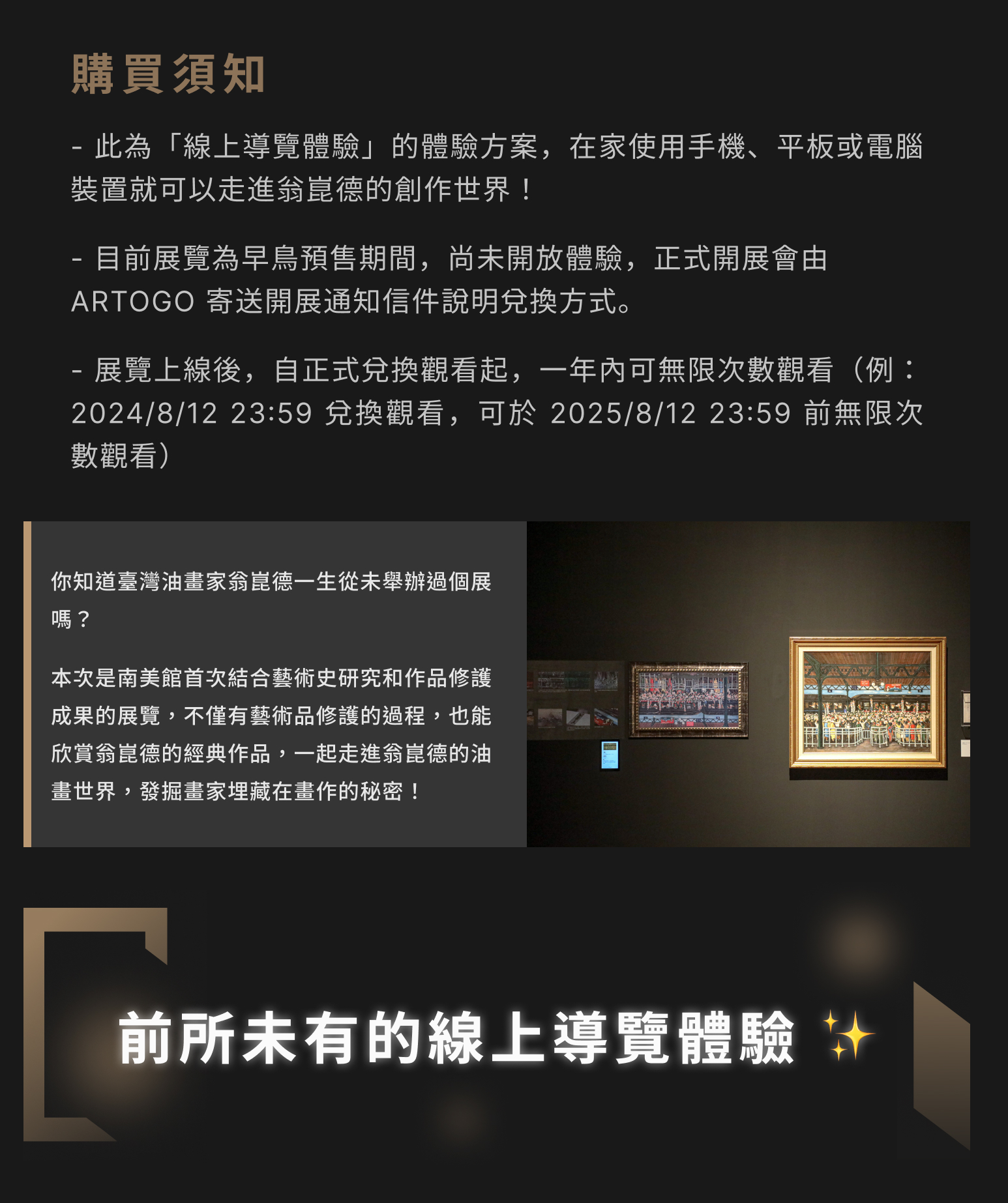 目前展覽尚為早鳥預售期間,尚未開放體驗,正式開展會由 ARTOGO 寄送開展通知信件說明兌換方式