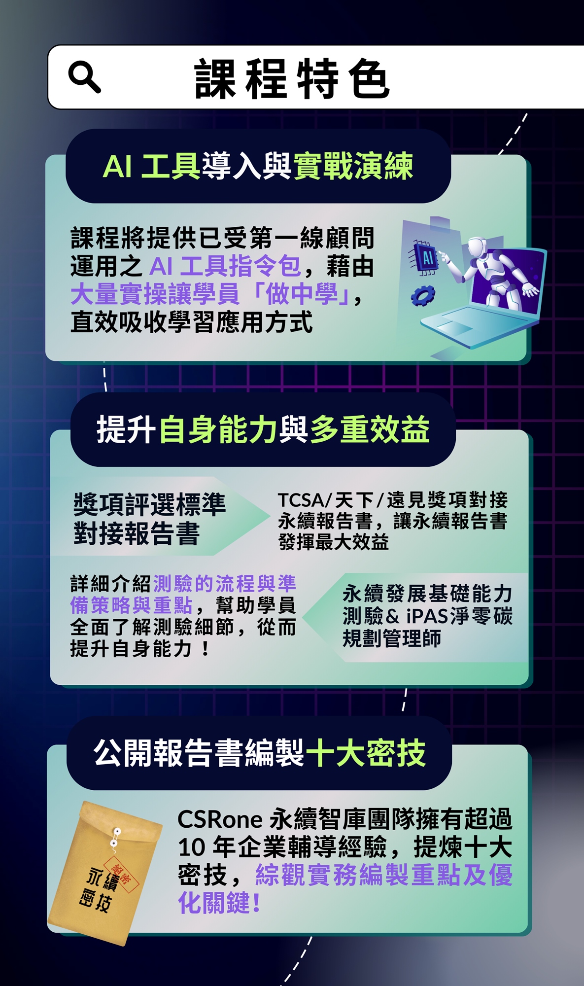 【本課程因招生不足取消,造成不變敬請見諒】 本次課程由 CSRone 永續智庫將透過實戰演練與最新技術的應用,協助參與者精通永續報告書的編製,並解析GRI、TCFD、SASB、IFRS等重要永續框架與趨勢。學員將學習如何利用AI工具大幅提升編製效率,並講解TCSA台灣企業永續獎項準則與最新IPAS產業人才能力鑑定測驗,同時增強企業與個人專業技能。立即加入本次課程,帶您掌握一「書」多吃的妙招,讓平凡的永續報告書轉化成企業的超級利器,達到多重效益!