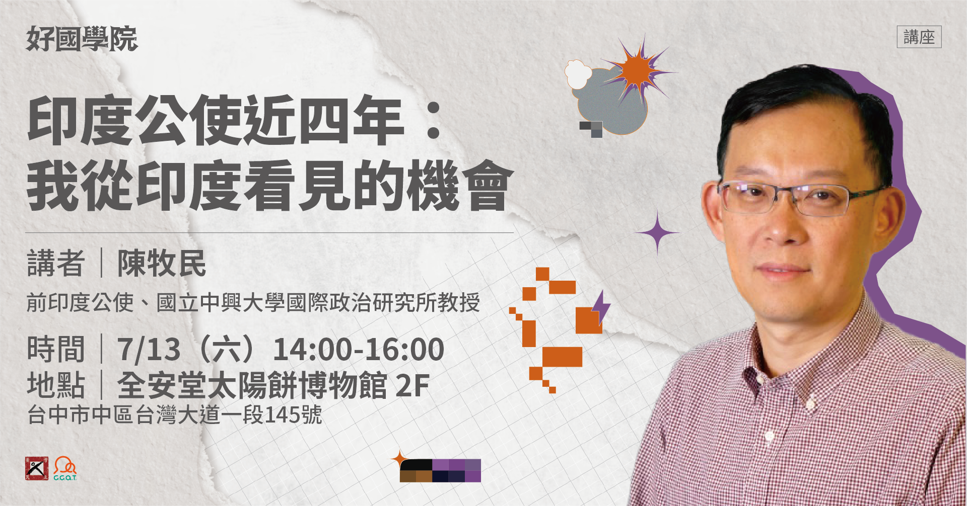 此次【印度公使近四年:我從印度看見的機會】將從個人角度出發,談各種在印度的發現、學者轉任公使的不同觀點,怎麼看待台灣-印度-中國的關係,以及分享他在印度所看見的機會。