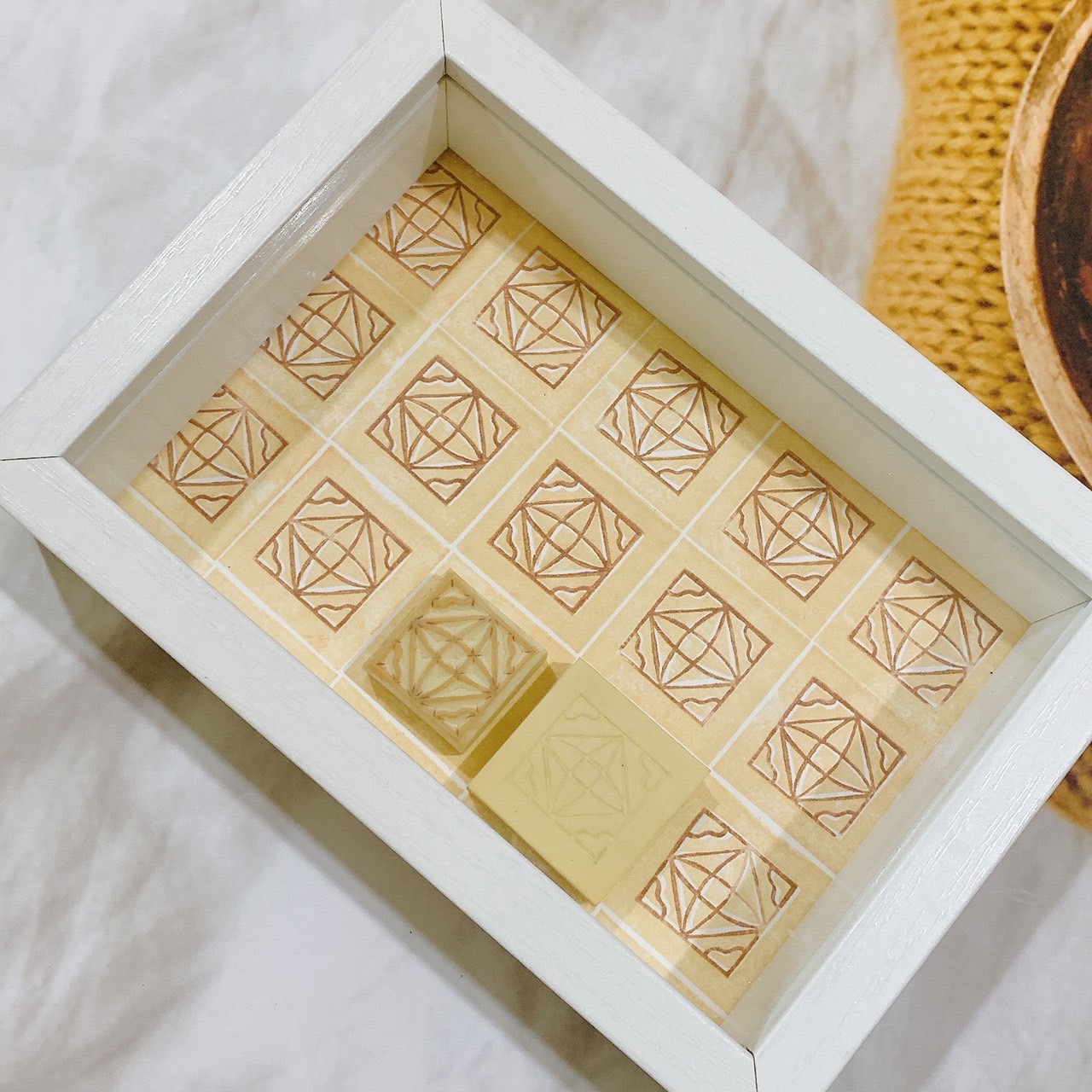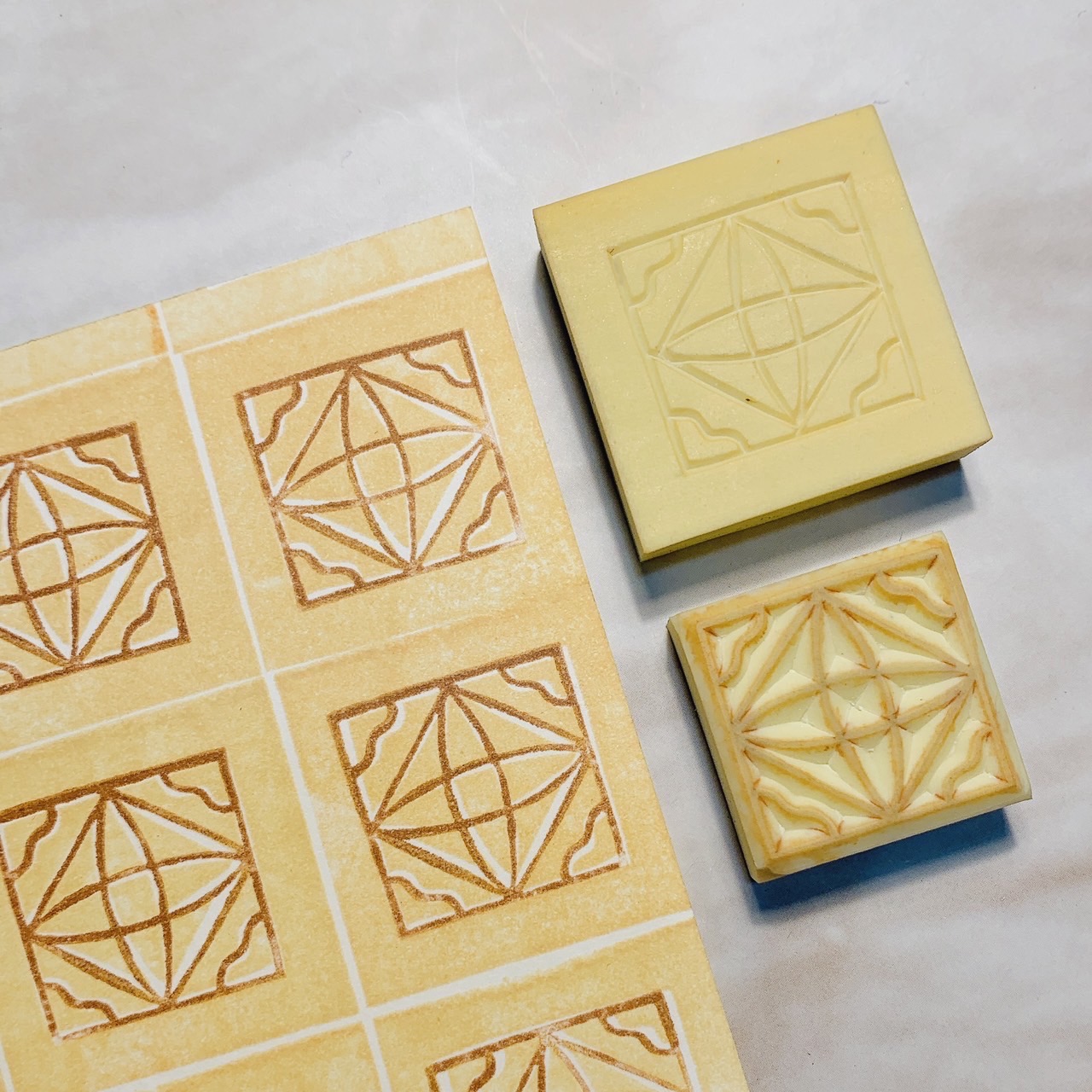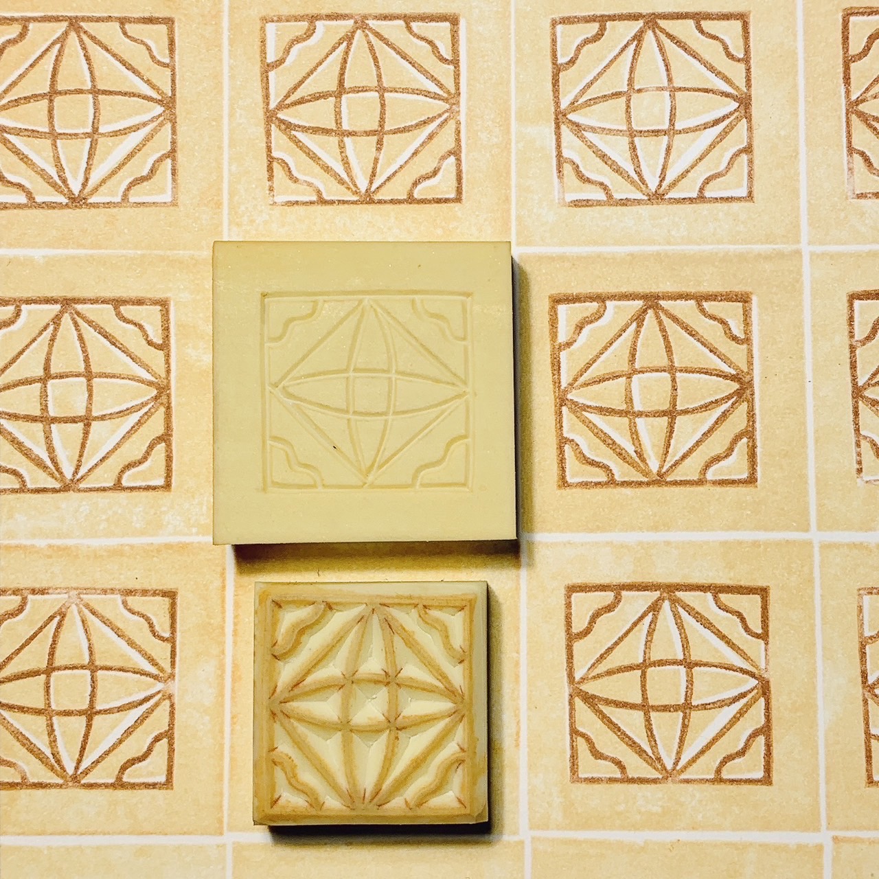 眷村的房舍中廚房、地板與牆面上多鋪有磁磚,兼具實用與美化功能,在不同區域常有不同的豐富花樣,各具特色與美感,為現今房舍的新式裝修中少見的藝術表現。此次工作坊帶領民眾觀察傳統花磚之美,並能重新描繪花磚的各式細節,透過刻印手法製作出專屬的老花磚印章,讓參與民眾都能帶走整片美好的生活切片。