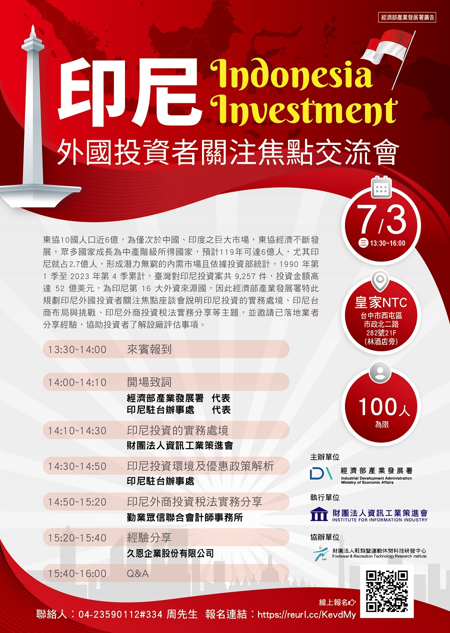 由經濟部產發署指導,資策會國際合作發展中心執行的「印尼外國投資者關注焦點交流會」,帶您一起瞭解印尼市場的新機遇,會中將分享印尼台商布局與挑戰並邀請4大會計師事務所之一的業者分享印尼外商投資稅法以及已落地業者分享經驗,協助投資者了解進入市場注意事項,並分享設廠評估事項,歡迎報名參加。