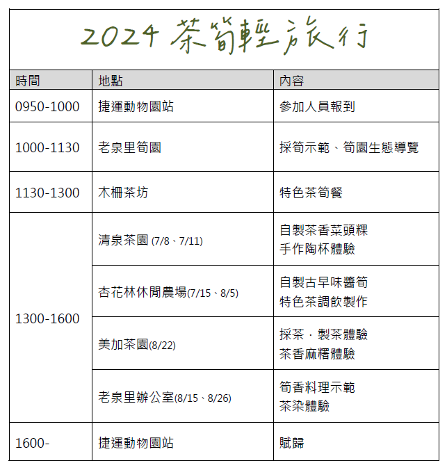 - 活動地點:老泉筍園 — 清泉廣場 / 杏花林休閒農場 / 美加茶園