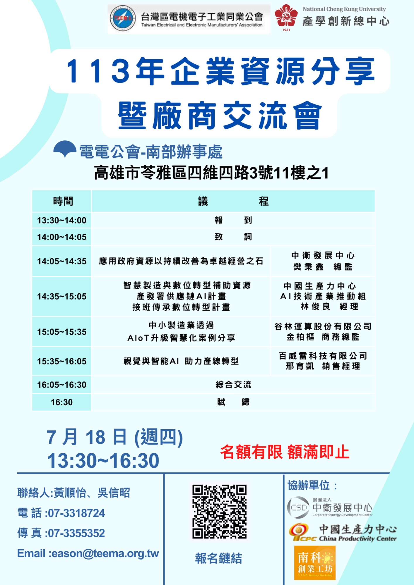 ●活動地點:台灣區電機電子工業同業公會南部辦事處(高雄市苓雅區四維四路3號11樓之1)