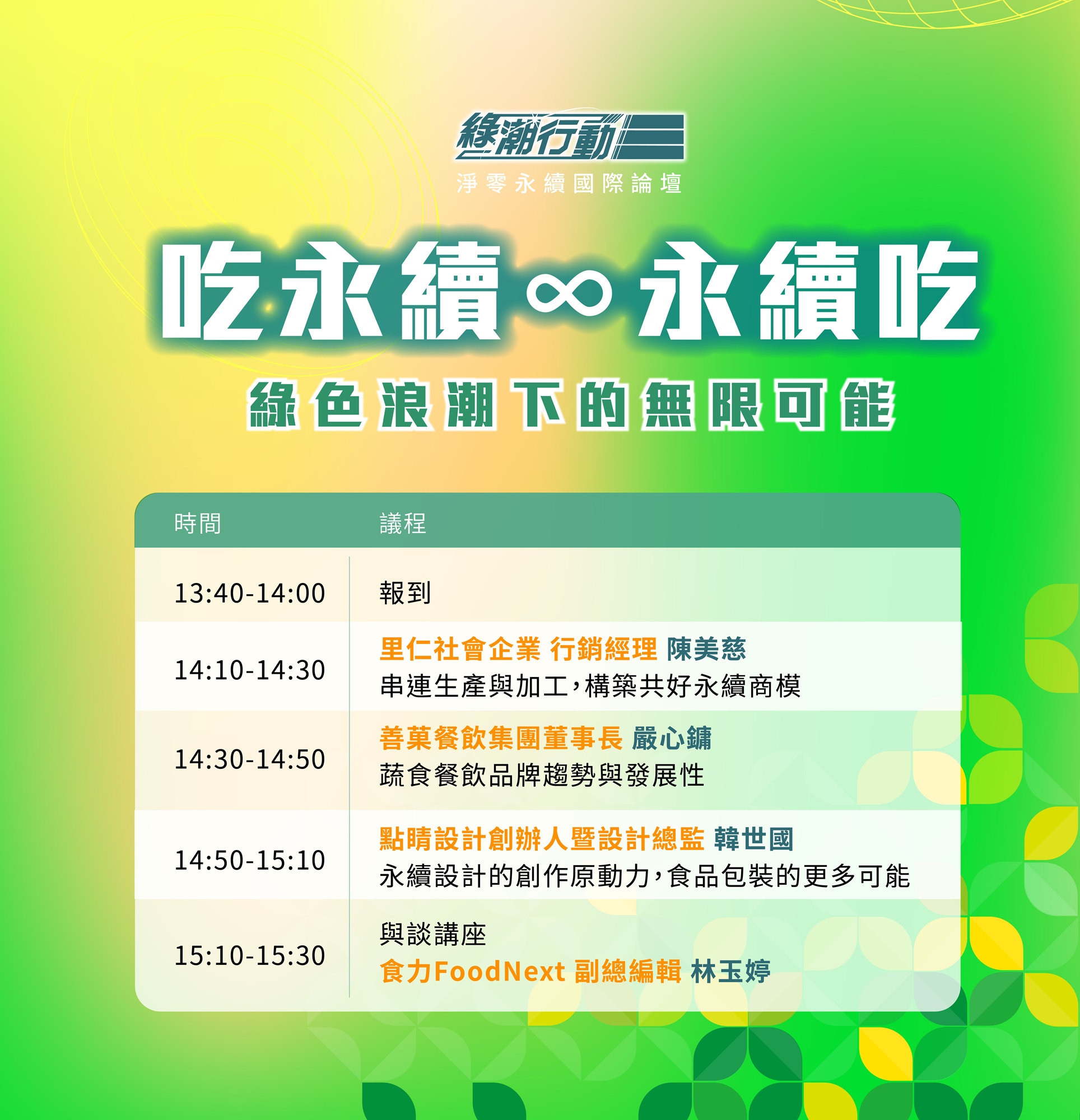 全球氣候變遷持續惡化,以實際行動改善刻不容緩,尤其飲食作為日常必需,被視為扭轉現況的關鍵之一,同時在臺灣吹起一股風潮;我們邀請三位講者,共同探討品牌在綠色浪潮上的挑戰關鍵與行動,如何透過餐飲、食品與設計的角度切入,開展永續飲食的各種可能性。