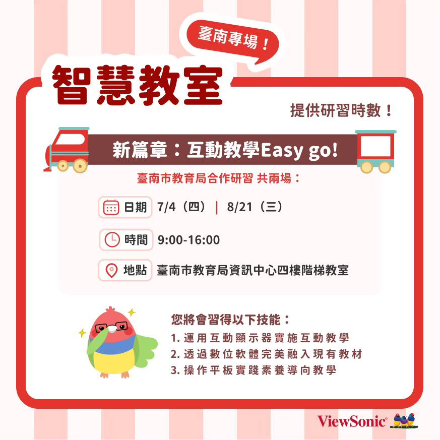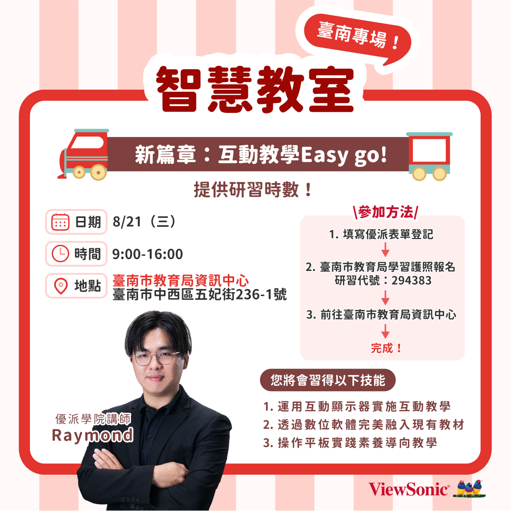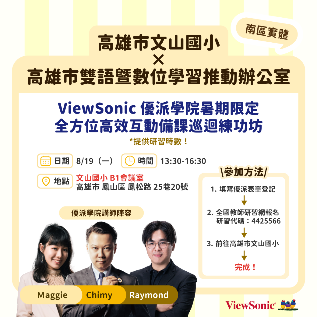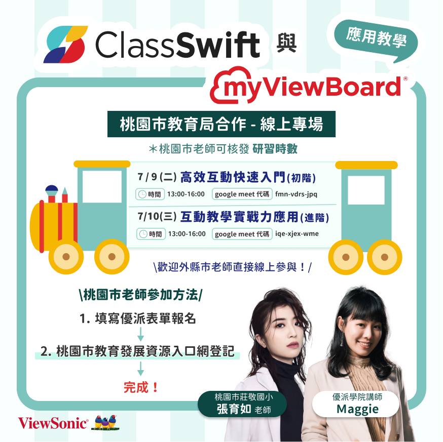 迎接學期末和暑假的來臨,教學科技增能可不能停!ViewSonic 與新北市教育局、桃園市教育局、臺南市教育網路中心、高雄市雙語暨數位學習推動辦公室合作開辦一系列研習!內容涵蓋 ClassSwift 與 myViewBoard 的初階和進階互動教學應用,深入探索高互動教學的實戰技巧。