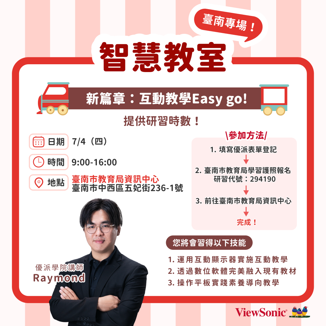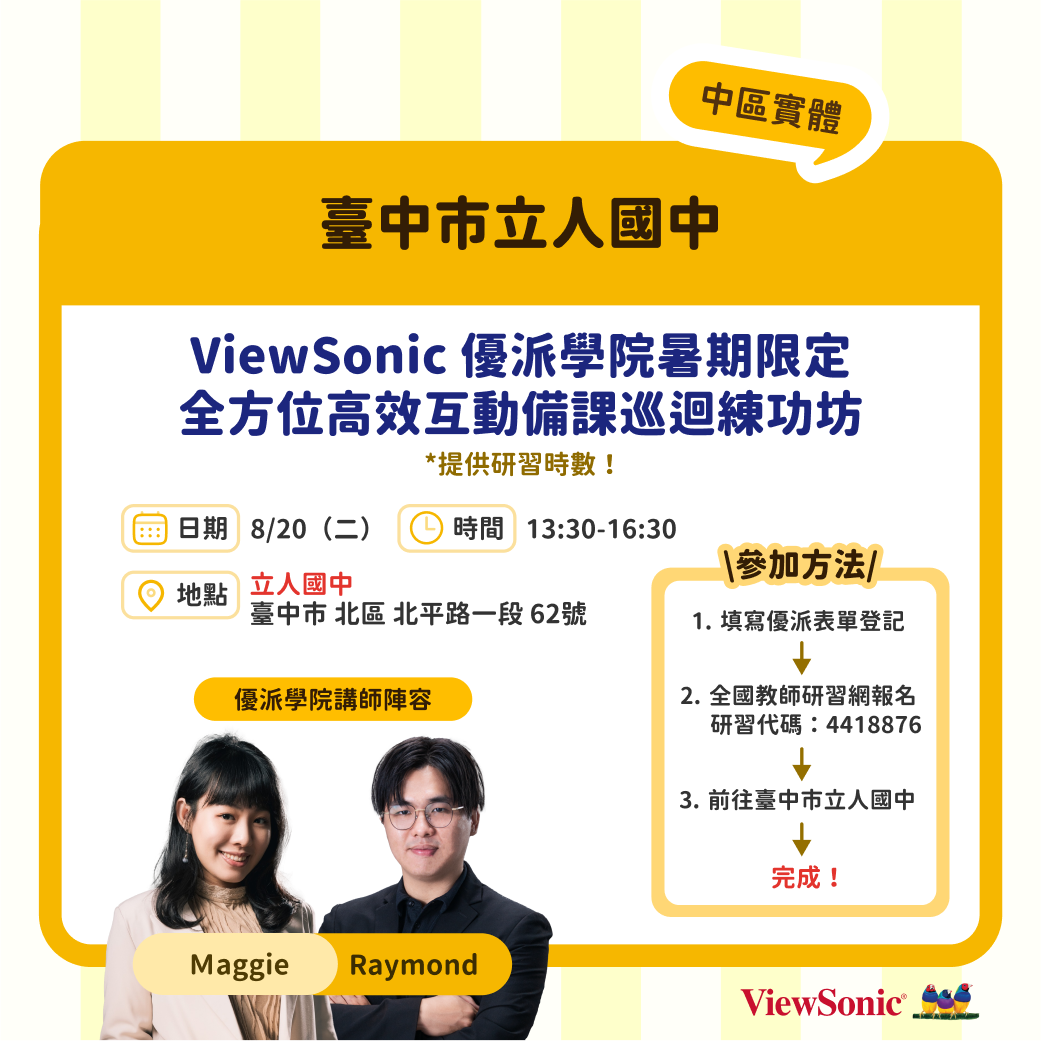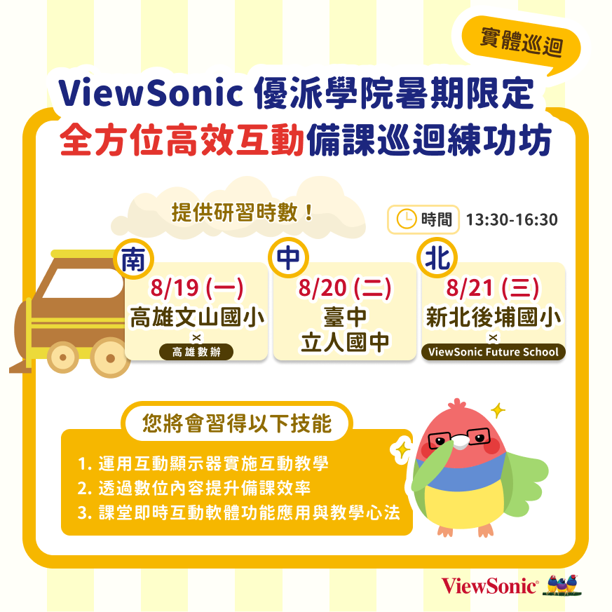一系列精彩研習場次,紮實課程內容,讓你滿載而歸。優派講師北中南貼心巡迴,你可以自由挑選報名參加,不論是線上高互動,還是實體相見歡,總會有你最適合的場次。現在就鎖定 ViewSonic 暑期增能研習列車,快速上手最實用的教學互動工具,給你課堂神助攻,教學大不同!