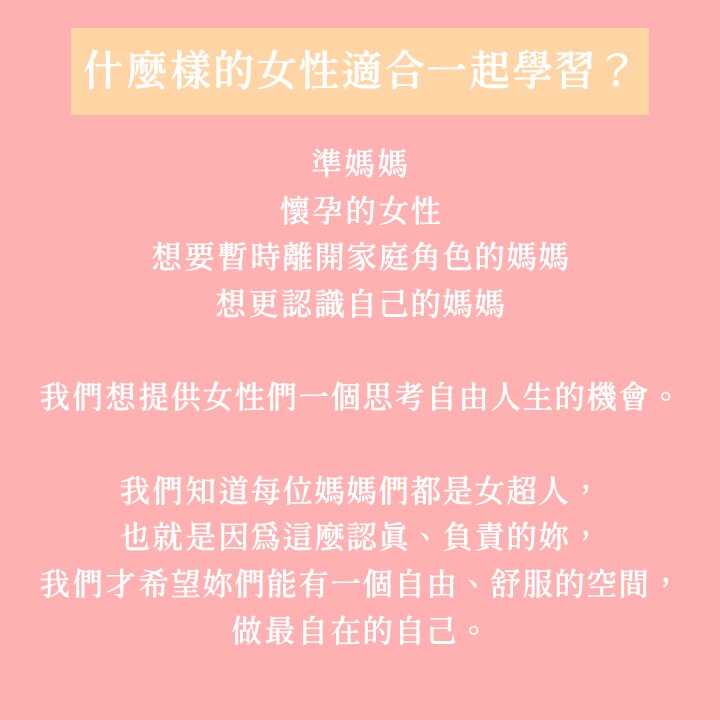 邀請您參加一場充滿音樂、放鬆和療癒的美好下午~ 此工作坊是經由十年來透過書籍、研究、實踐等累積所研發,我們理解,作為準媽媽、媽媽,生活可能充滿責任和束縛,我們邀請您參加工作坊,您值得擁有一個自由和喜悅的生活!