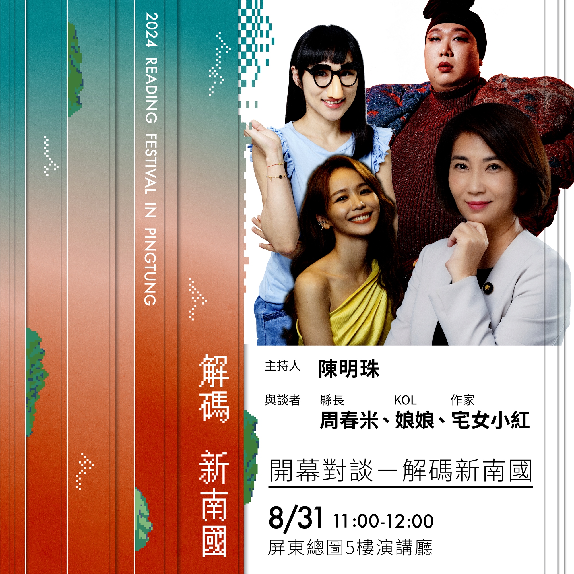 開幕對談上,邀請屏東縣長周春米、作家宅女小紅與KOL娘娘,並由陳明珠擔任主持人,將從當代現在的多面向,探討與解碼新南國,以及在當代社會中,如何橫跨多種領域,達到跨界的各種可能性。